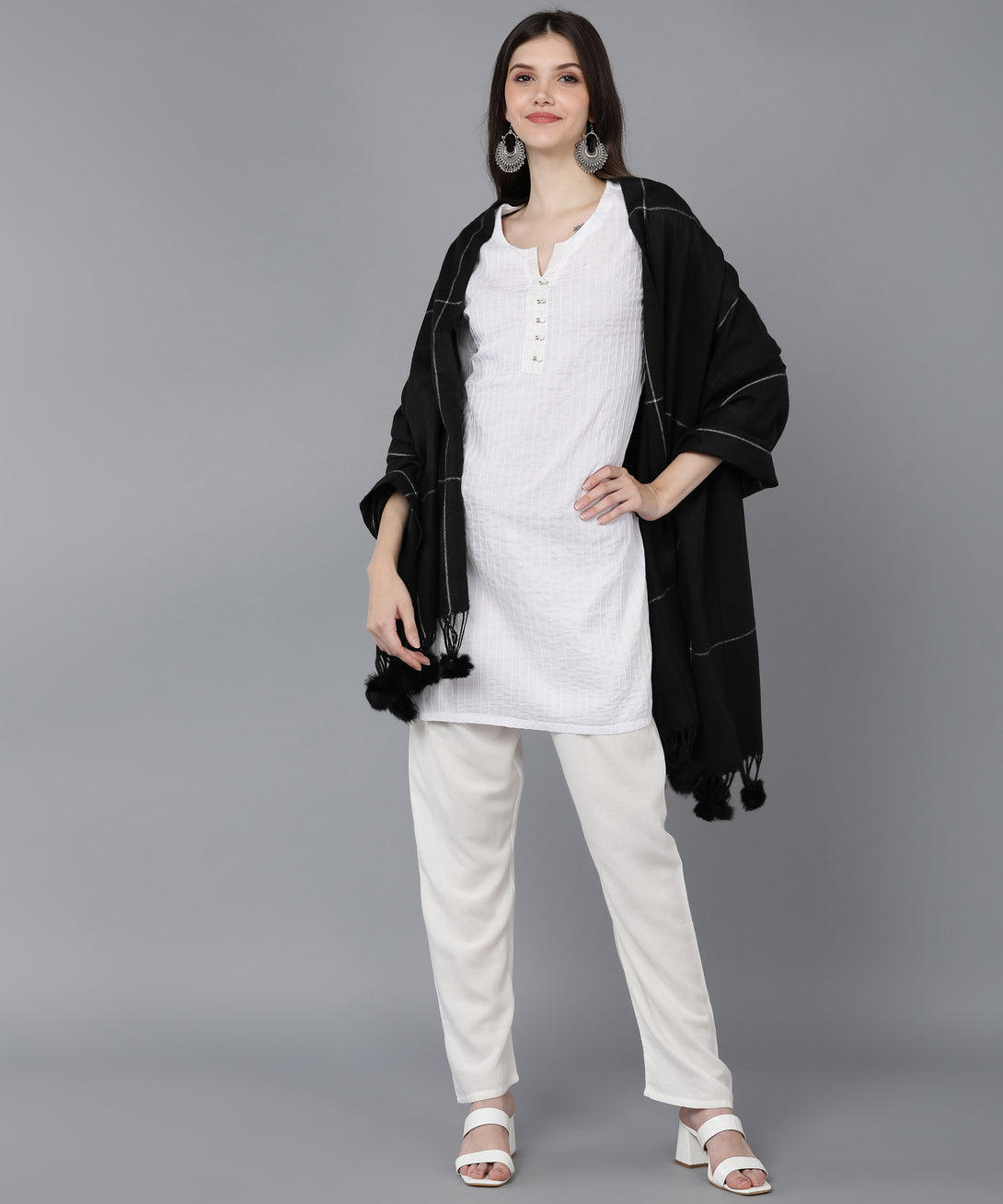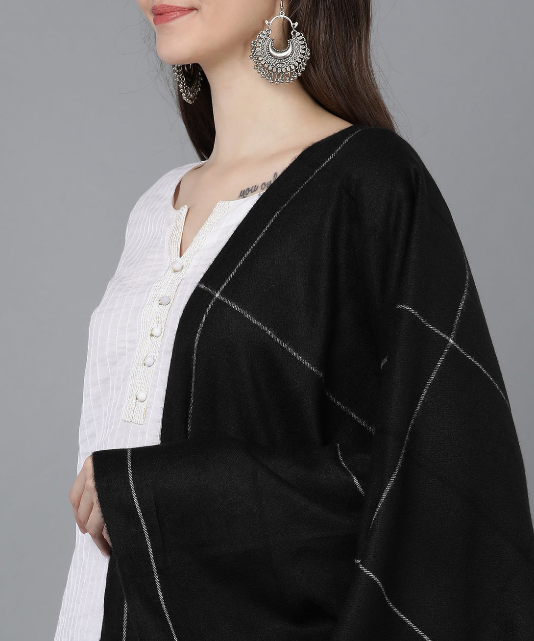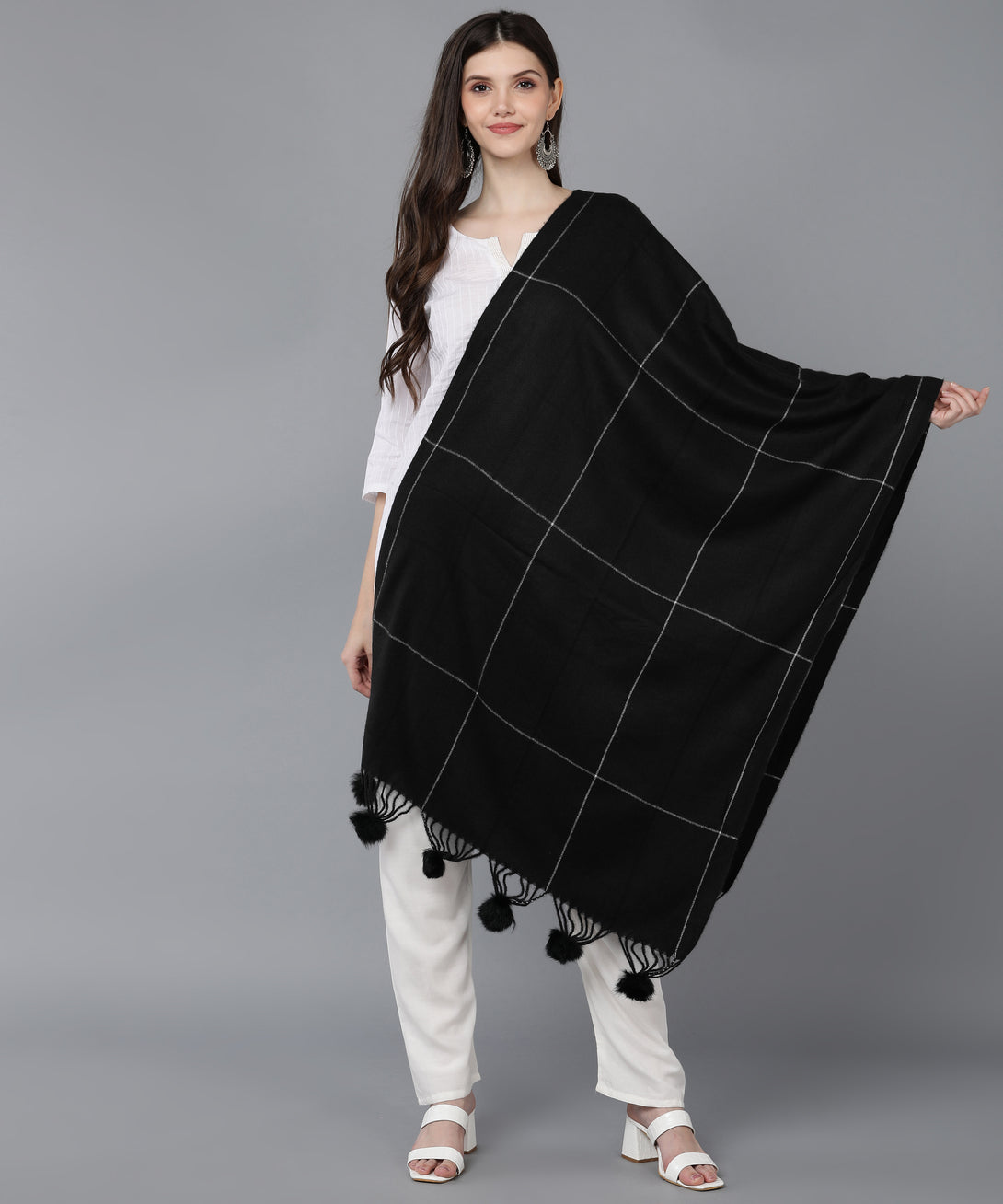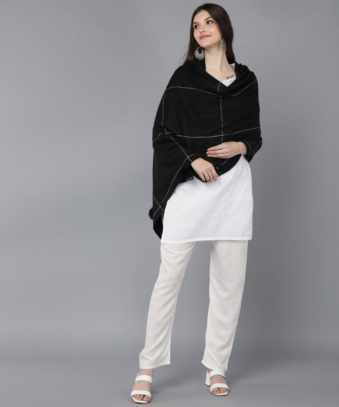 The Jayri 100% Soft Woolen Women's Black Stole is the perfect combination of warmth and elegance. This Winter Round Stole is elegant and cozy, and it's made for the cold months. This opulent accessory will elevate your look and give your ensemble a dash of sophisticated appeal.