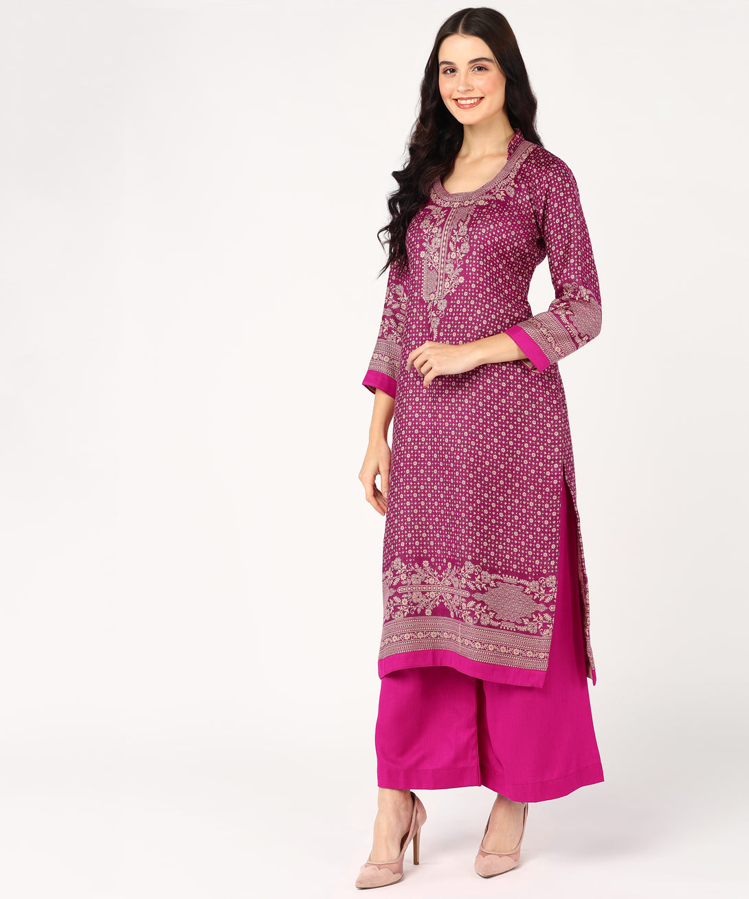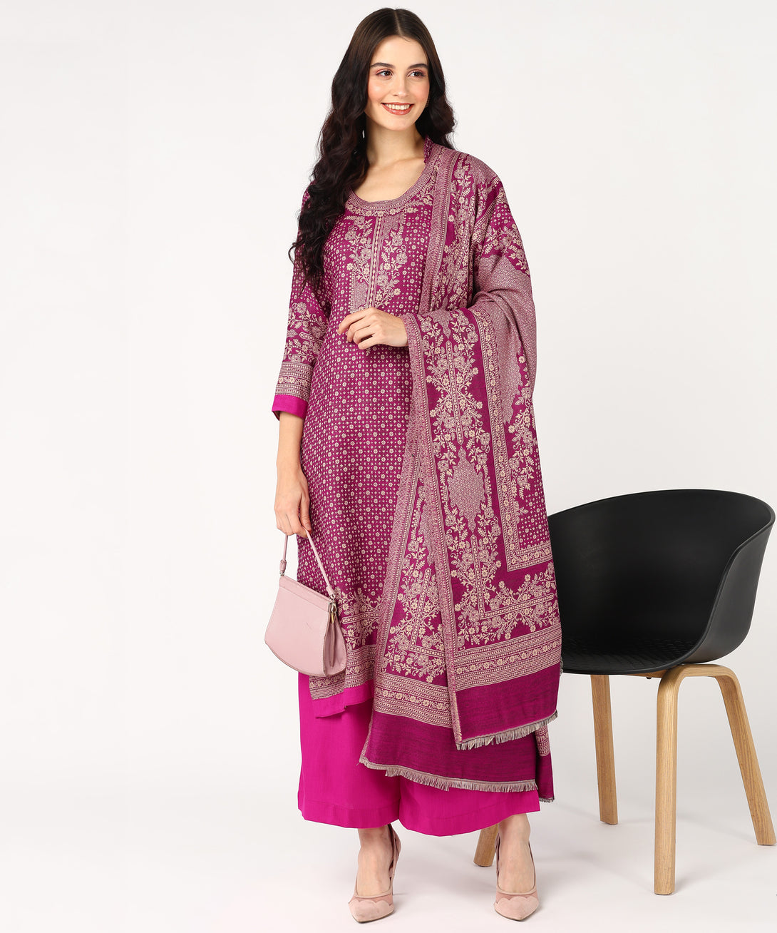 Presenting Jayri's Women's Hot Pink Cottswool Unstitched Kurta and Palazzo Suit Material with a gorgeous Kani Jamawar pattern. A matching shawl completes this winter set,...