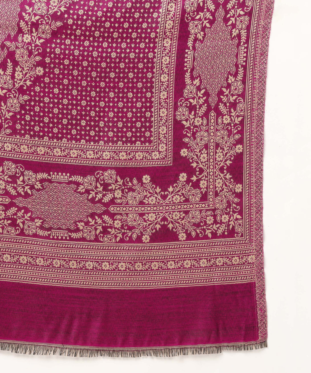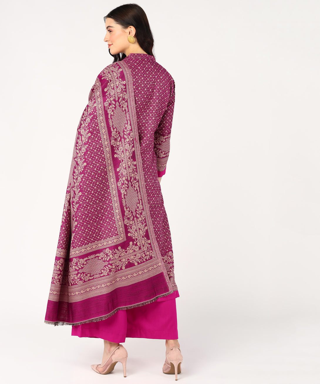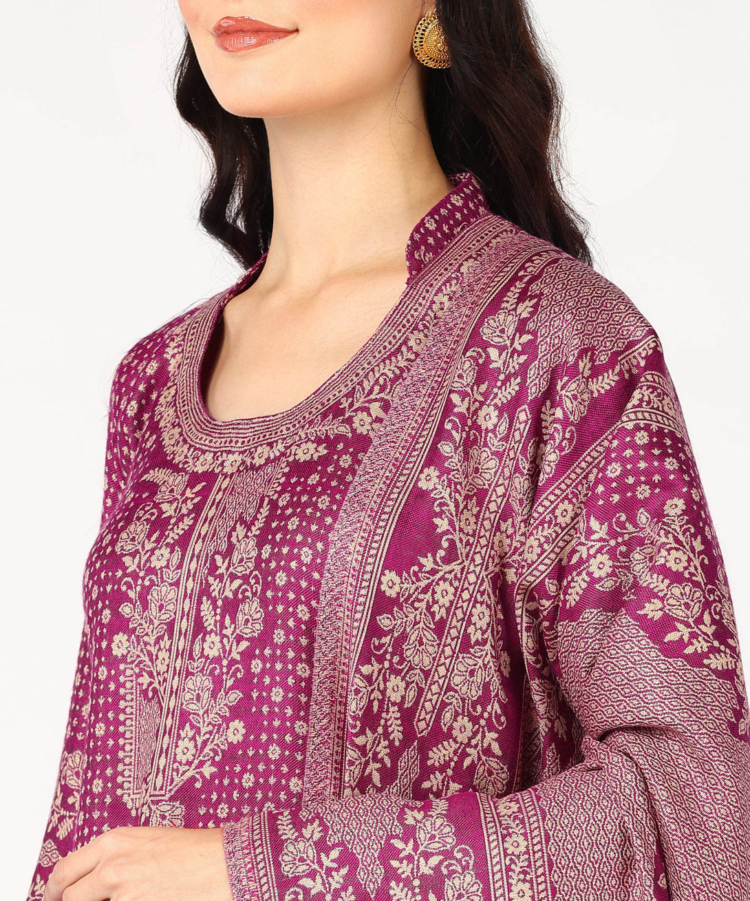 Presenting Jayri's Women's Hot Pink Cottswool Unstitched Kurta and Palazzo Suit Material with a gorgeous Kani Jamawar pattern. A matching shawl completes this winter set, adding style and comfort. This opulent ensemble will elevate your look and is perfect for the comfort and sophistication of chilly weather.