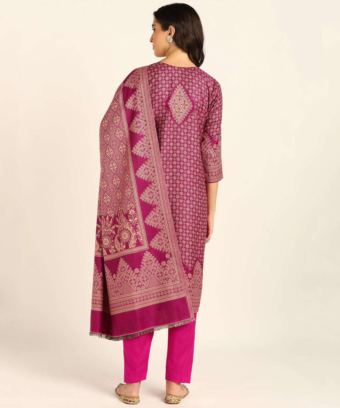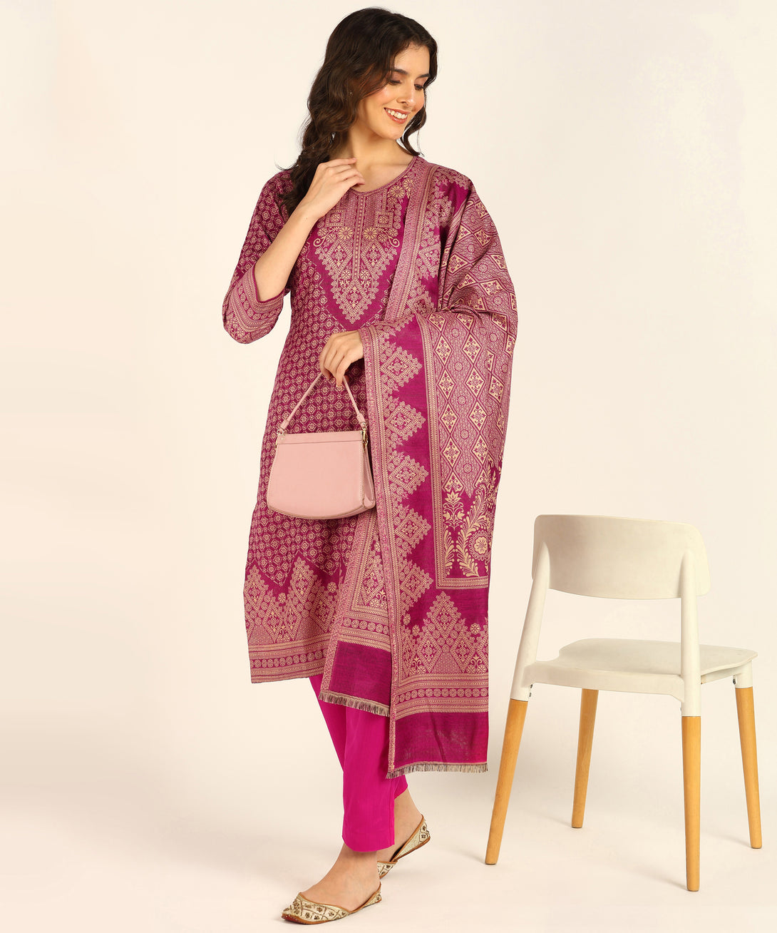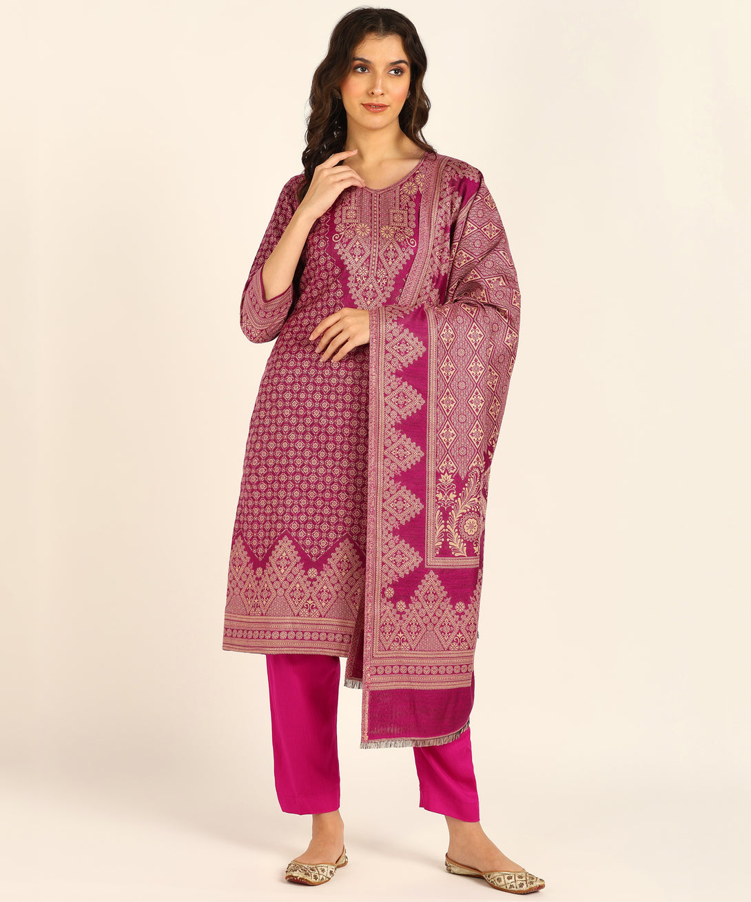 Discover refinement in the Hot Pink hue of Jayri's Women's CottsWool Unstitched Kurta & Palazzo Kani Jamawar Design Suit Material. This combination exudes warmth and elegance when worn with a matching shawl. It radiates richness and coziness, making it the perfect choice for a fashionable yet warm winter statement.