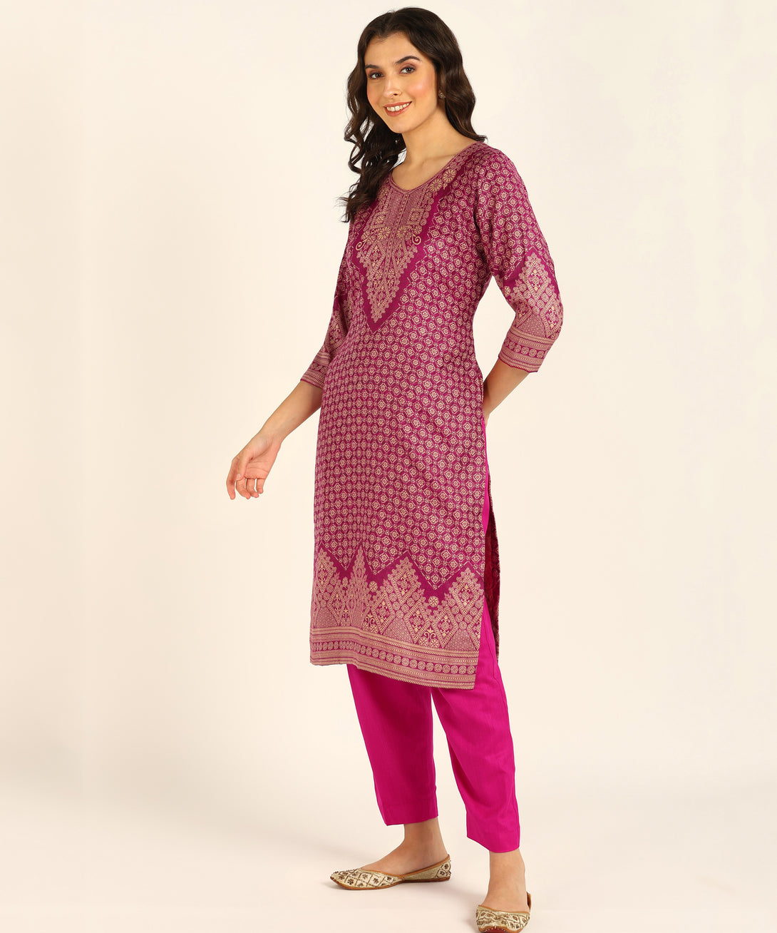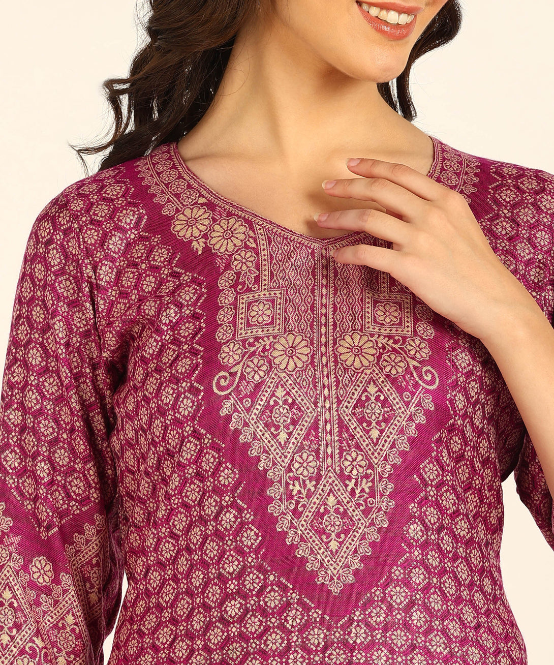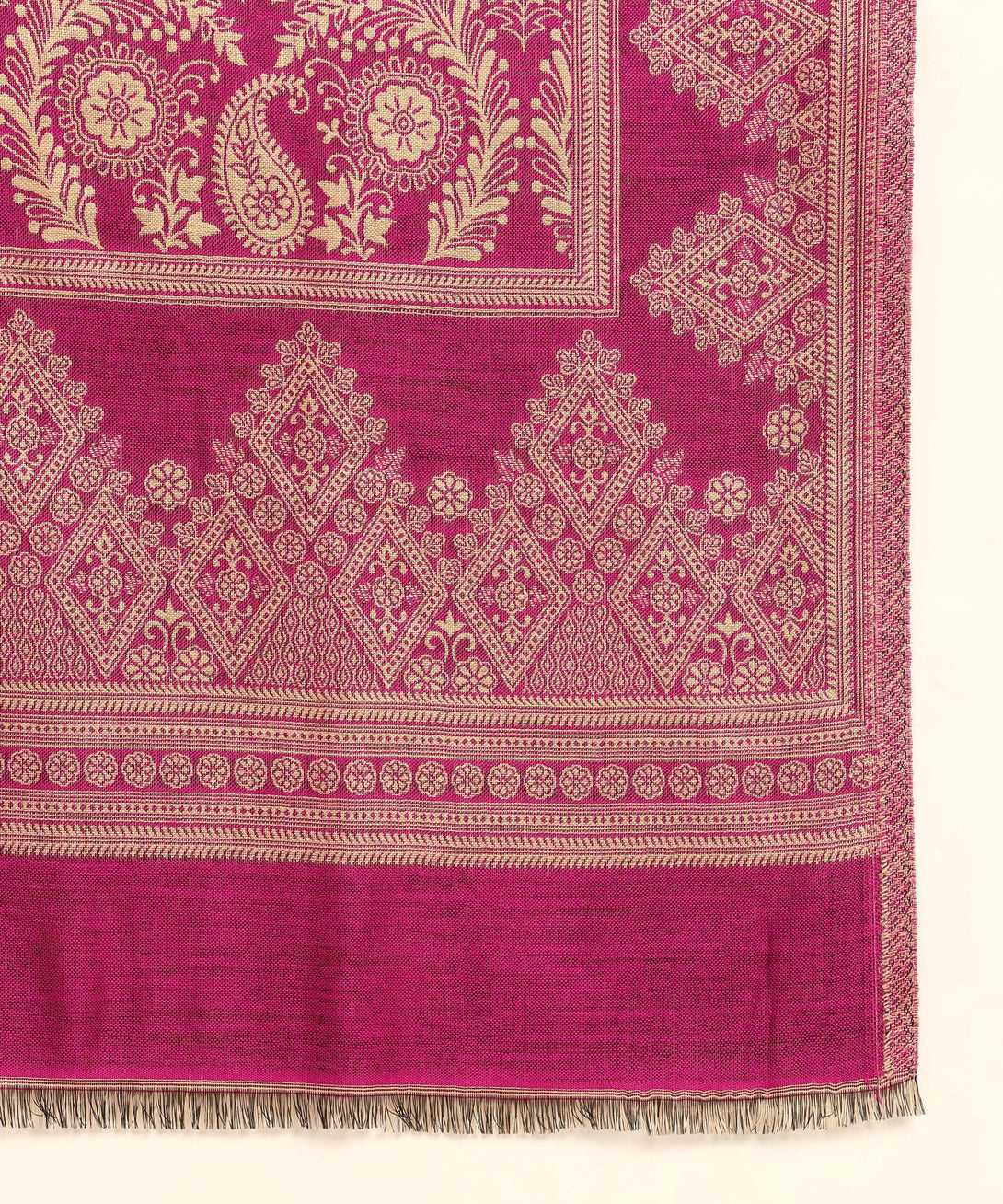 Discover refinement in the Hot Pink hue of Jayri's Women's CottsWool Unstitched Kurta & Palazzo Kani Jamawar Design Suit Material. This combination exudes warmth and elegance when worn with a matching shawl. It radiates richness and coziness, making it the perfect choice for a fashionable yet warm winter statement.