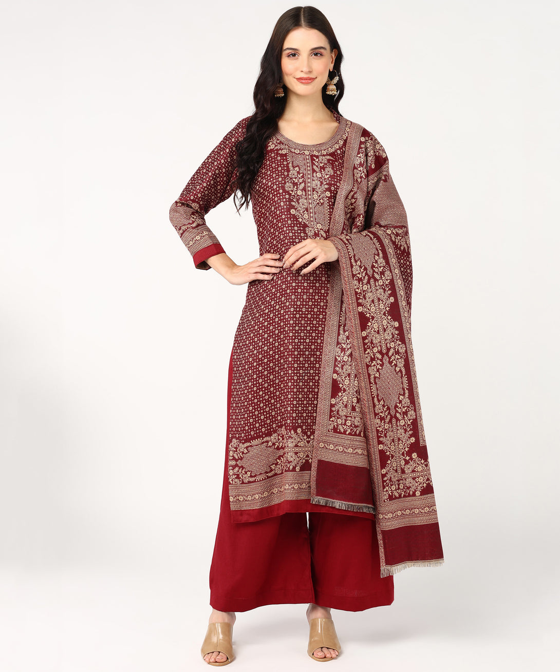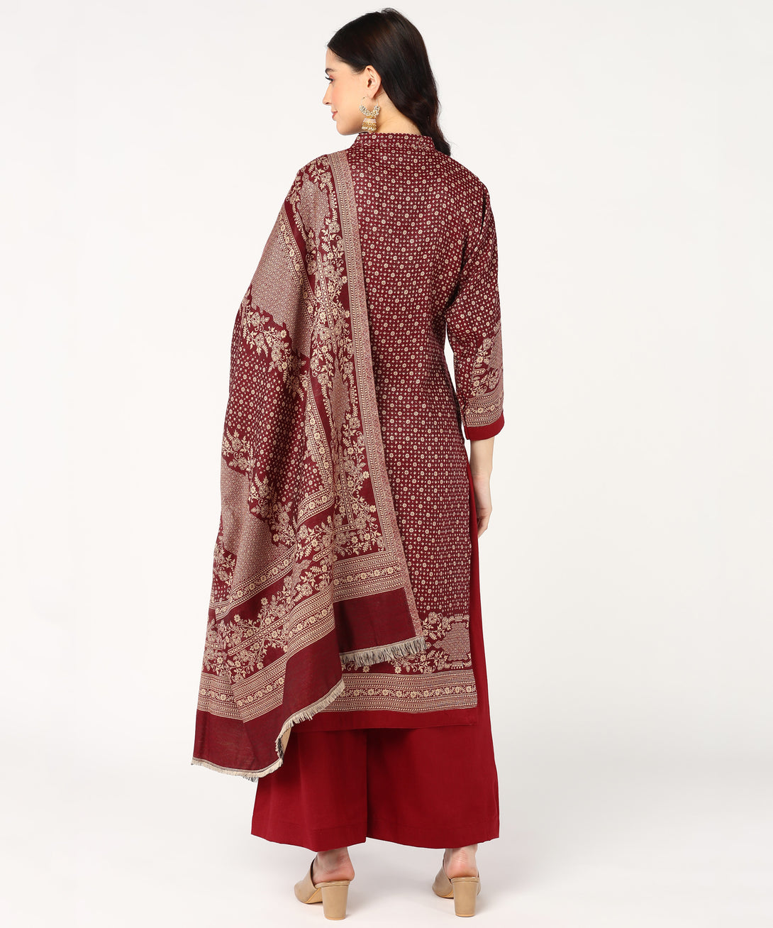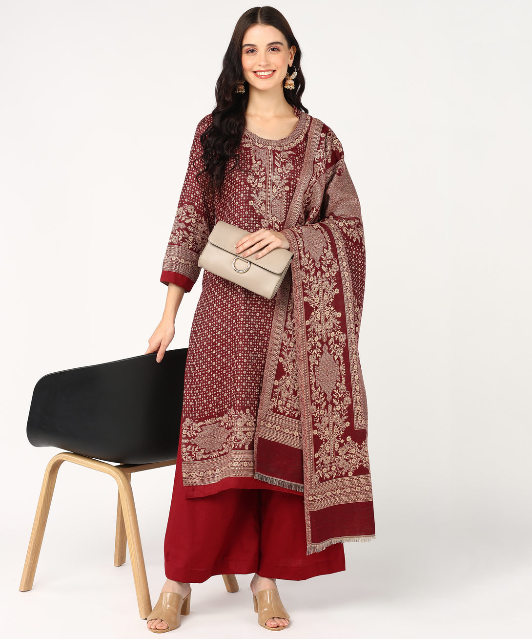 With its rich maroon color and gorgeous Kani Jamawar design, Jayri's Women's Cottswool Unstitched Kurta & Palazzo Suit Material will elevate your wintertime look. A matching shawl completes the ensemble, adding refinement and coziness. It's ideal for the season, combining coziness and style to create a stylish winter statement.