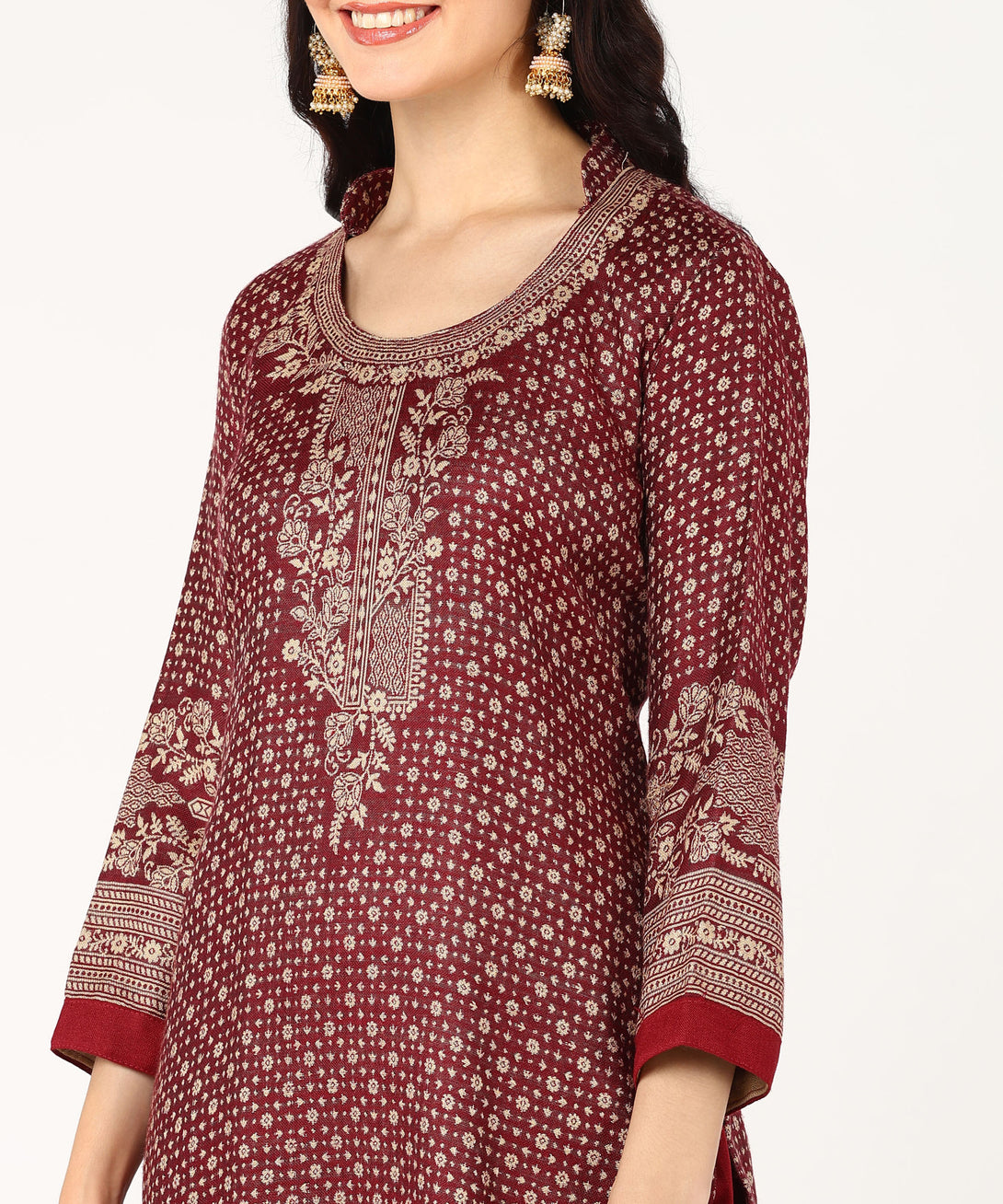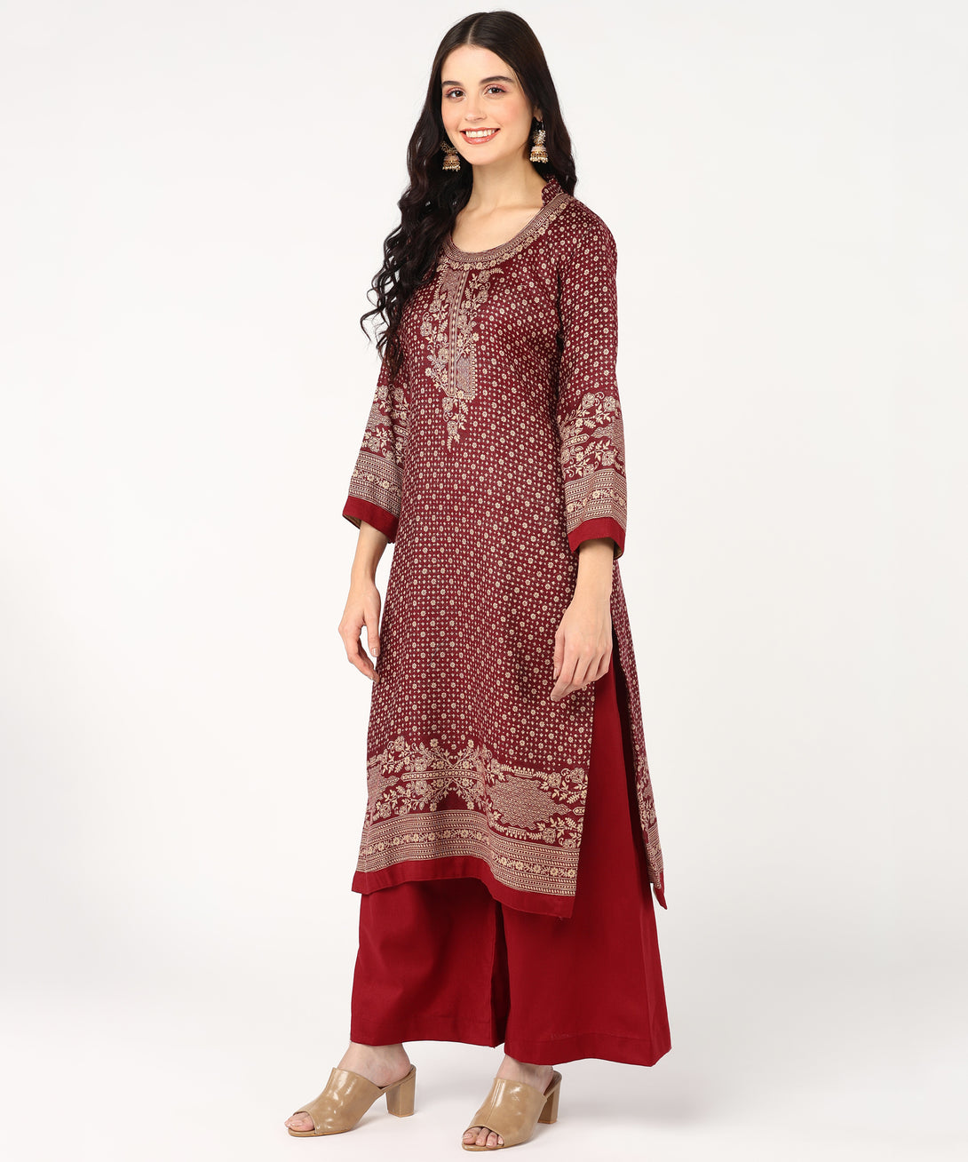 With its rich maroon color and gorgeous Kani Jamawar design, Jayri's Women's Cottswool Unstitched Kurta & Palazzo Suit Material will elevate your wintertime look. A...