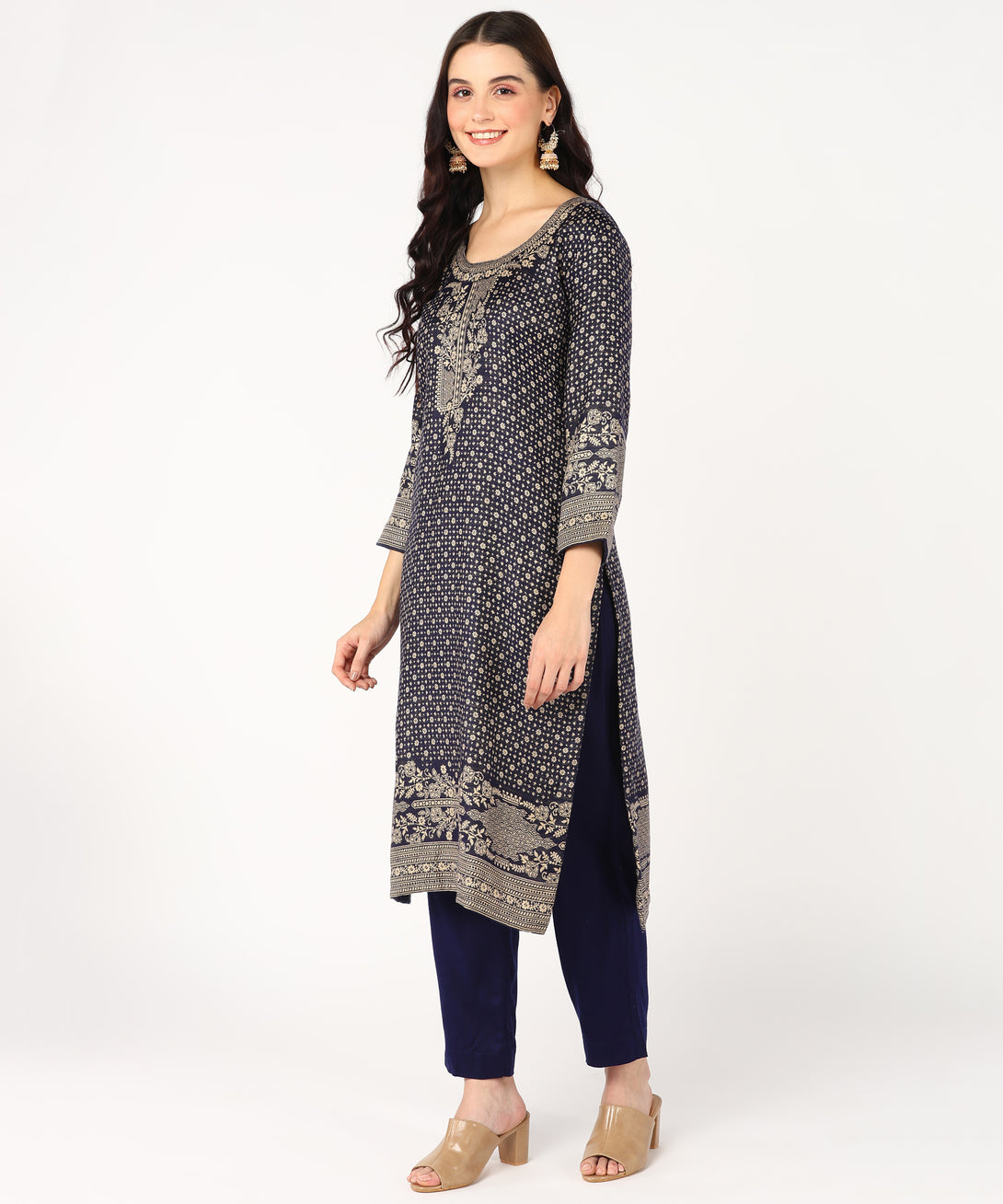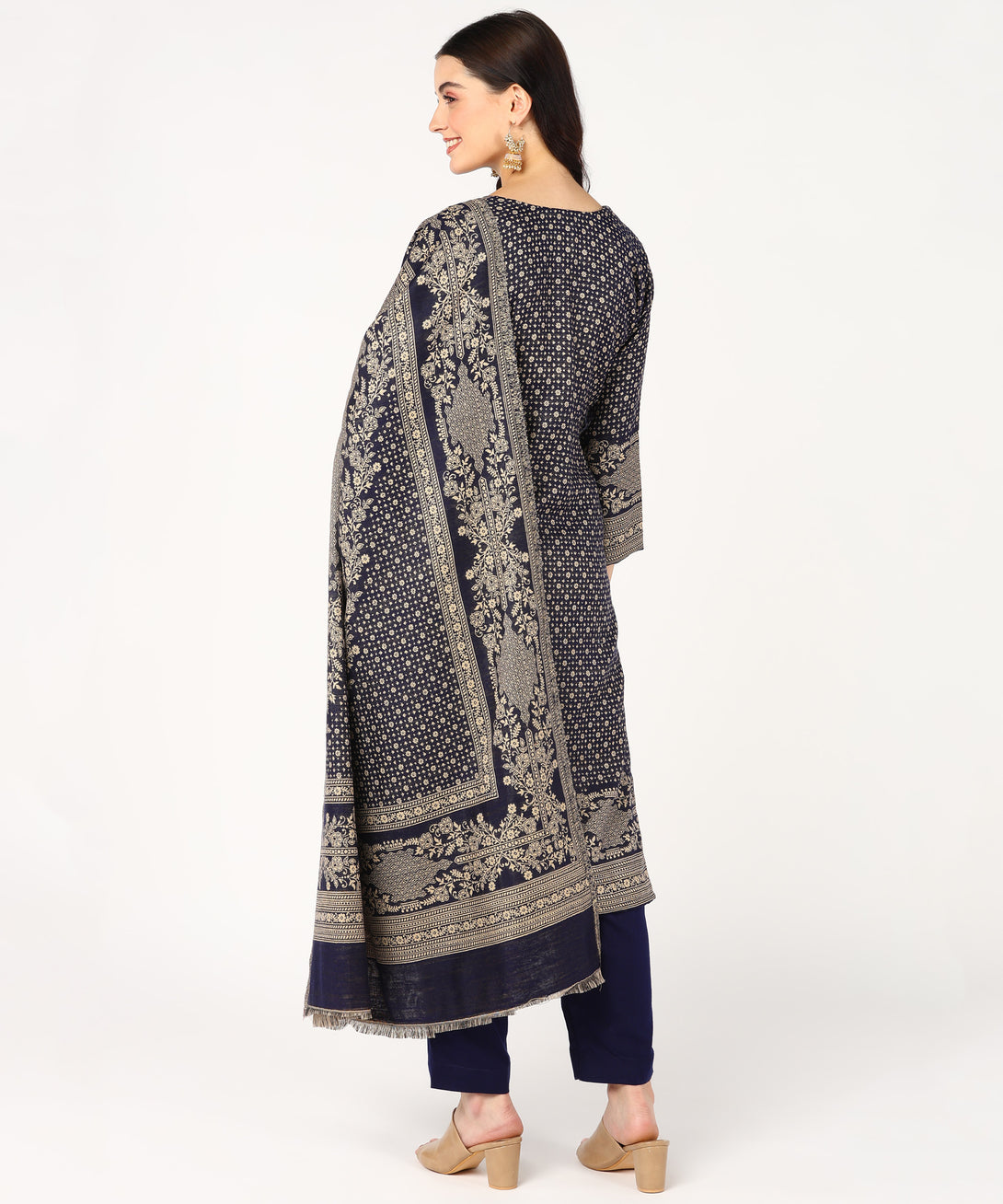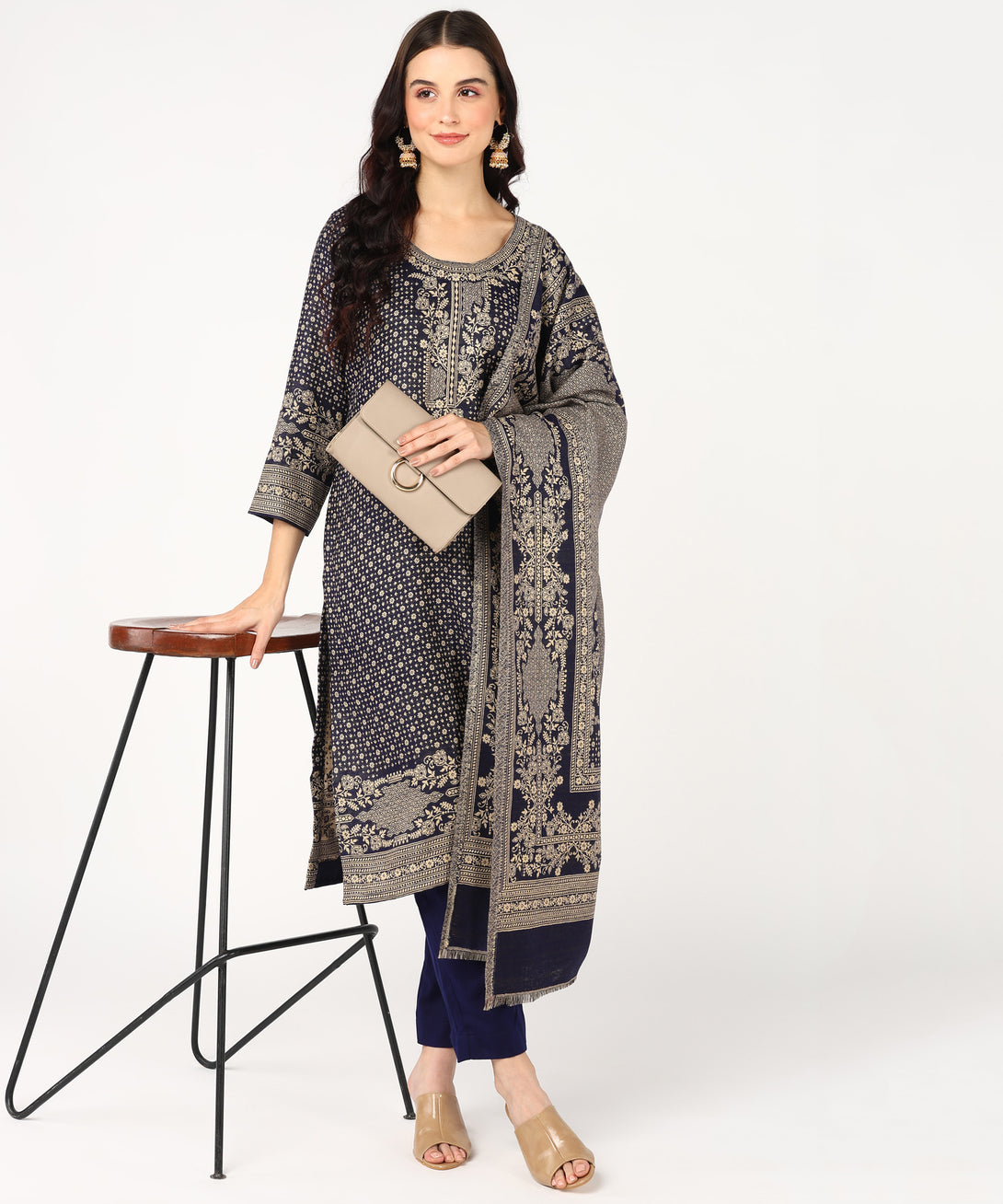 Discover sophistication in the deep Navy Jayri Women's Cottswool Unstitched Kurta & Palazzo Suit Material. With a matching shawl, this ensemble has a beautiful Kani...