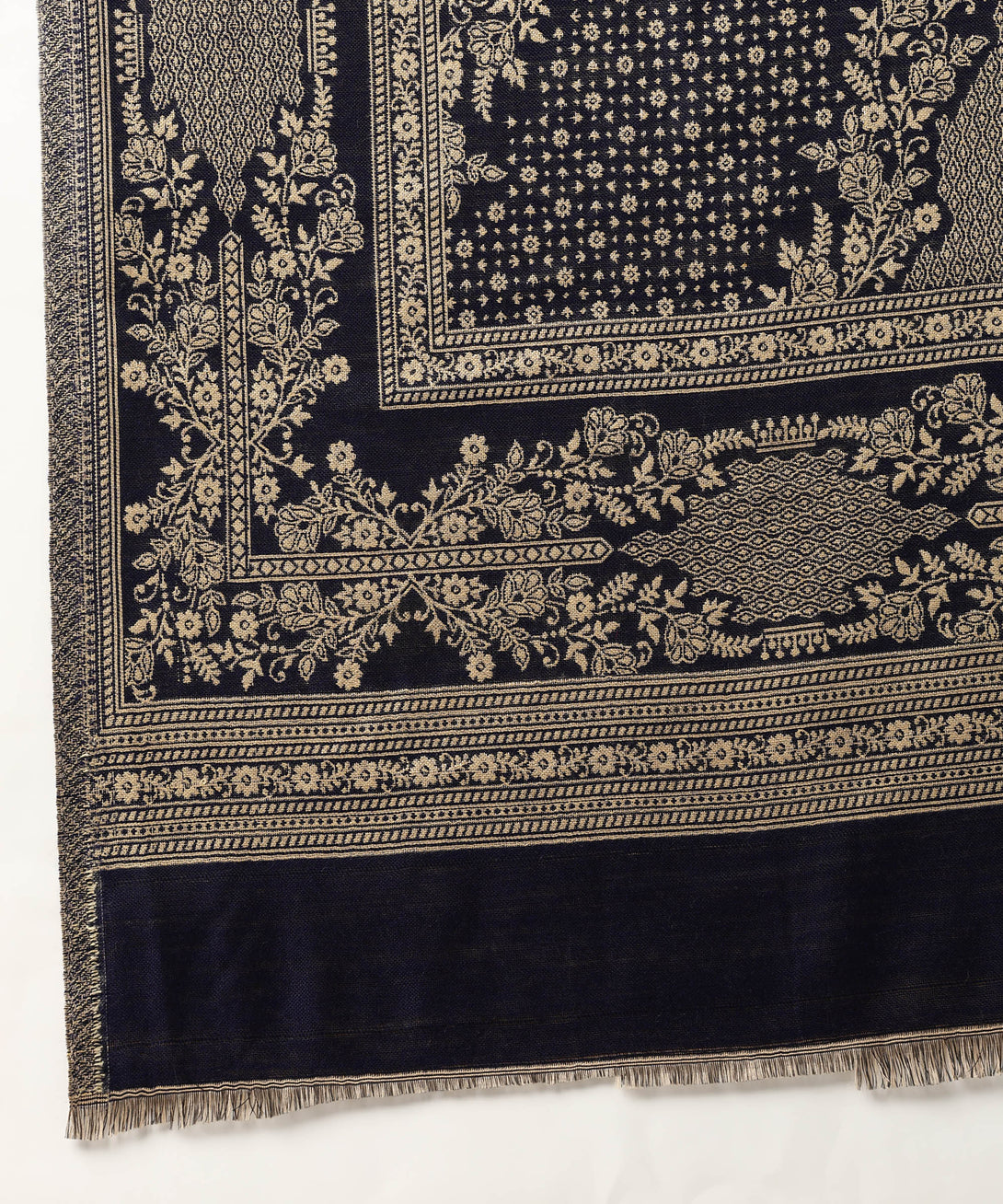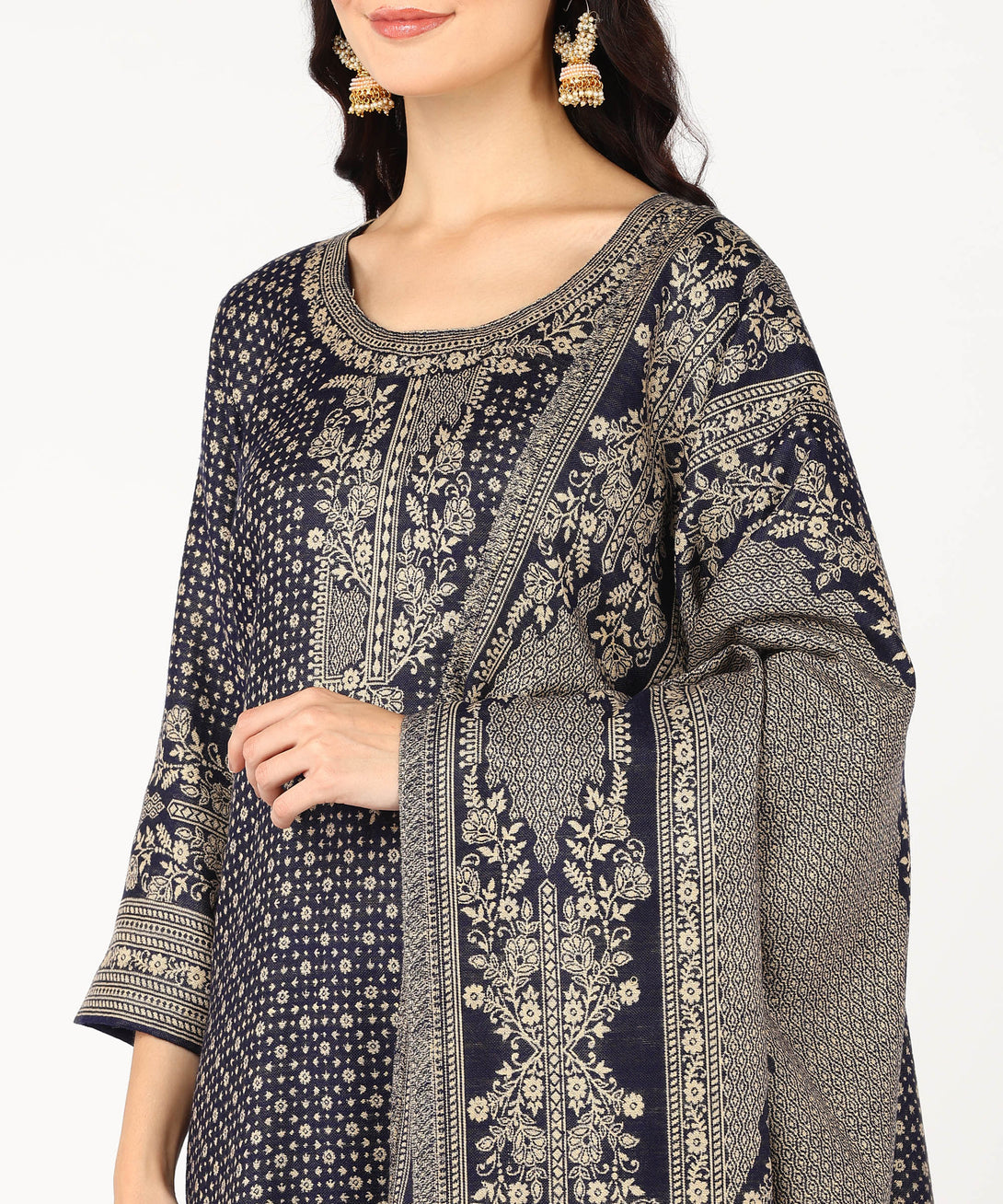 Discover sophistication in the deep Navy Jayri Women's Cottswool Unstitched Kurta & Palazzo Suit Material. With a matching shawl, this ensemble has a beautiful Kani Jamawar design. It's the ideal winter combination, combining warmth and sophistication to create a chic look that's appropriate for the season's fashion statement.