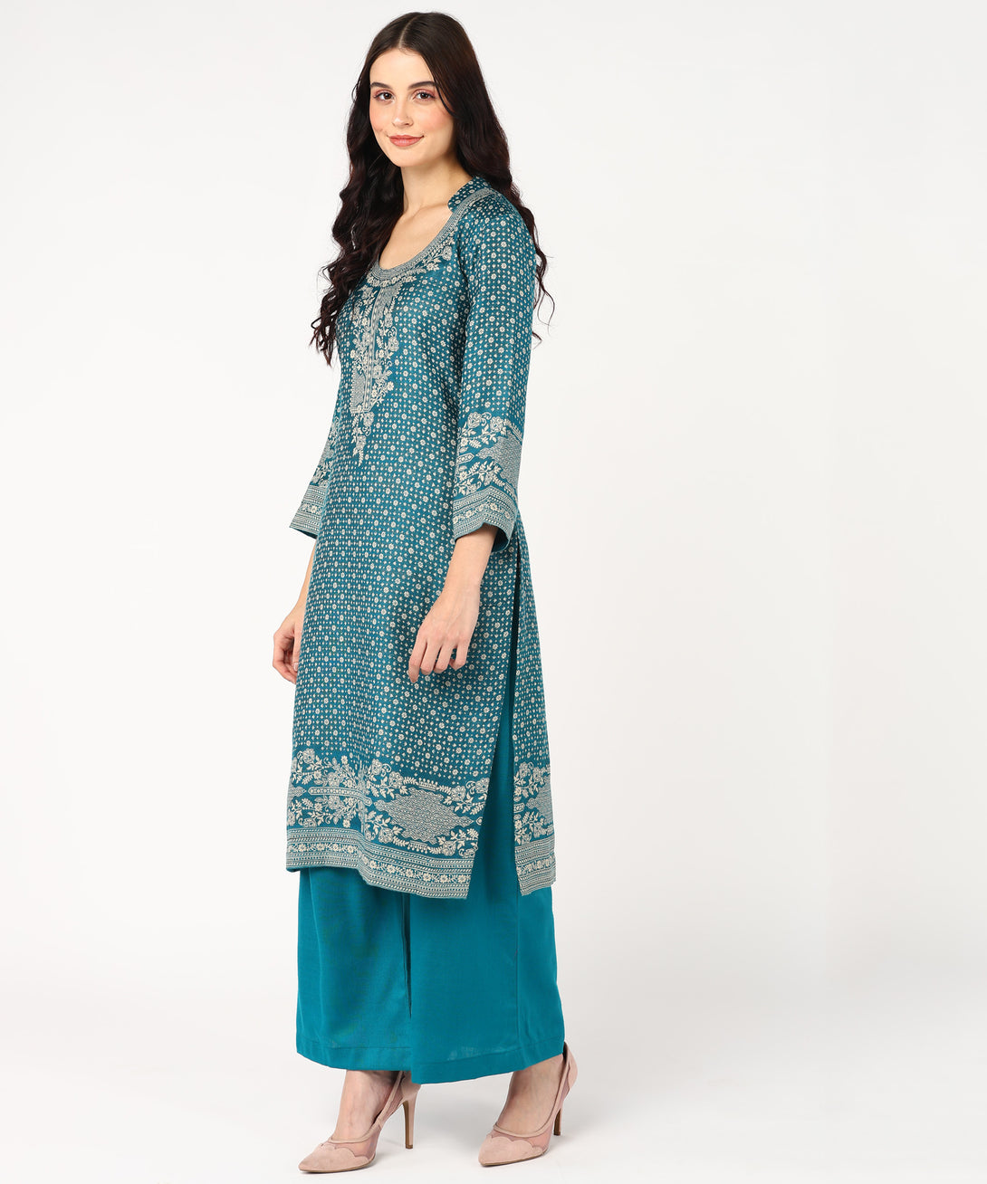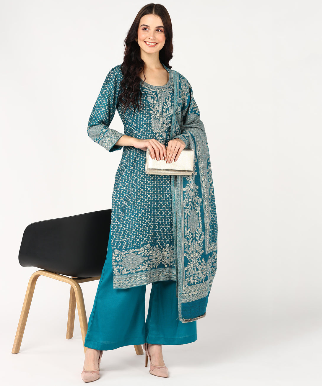 Enjoy a sophisticated look with the tranquil Sea Green Women's Cottswool Unstitched Kurta & Palazzo Suit Material from Jayri. This outfit has a matching shawl...