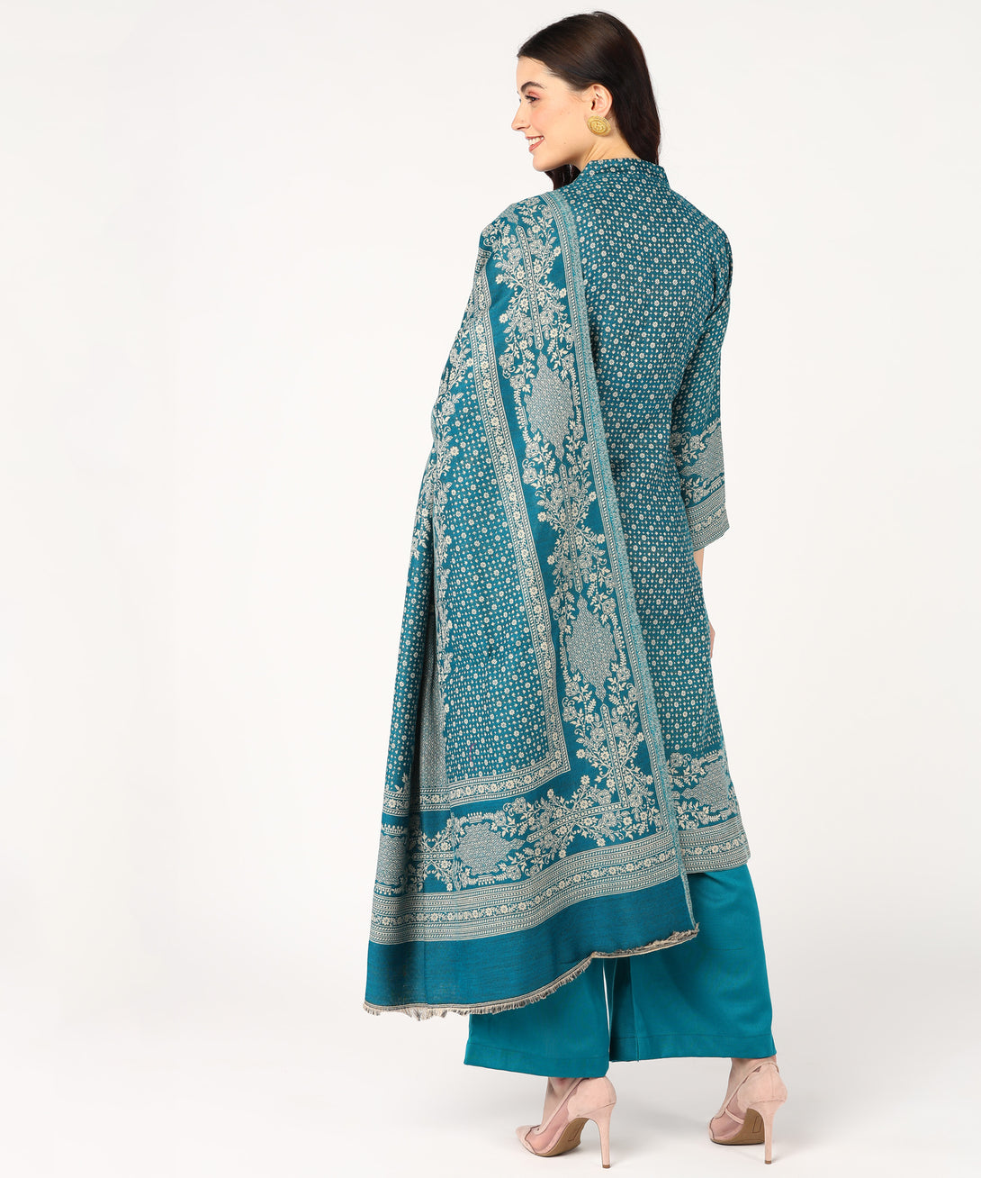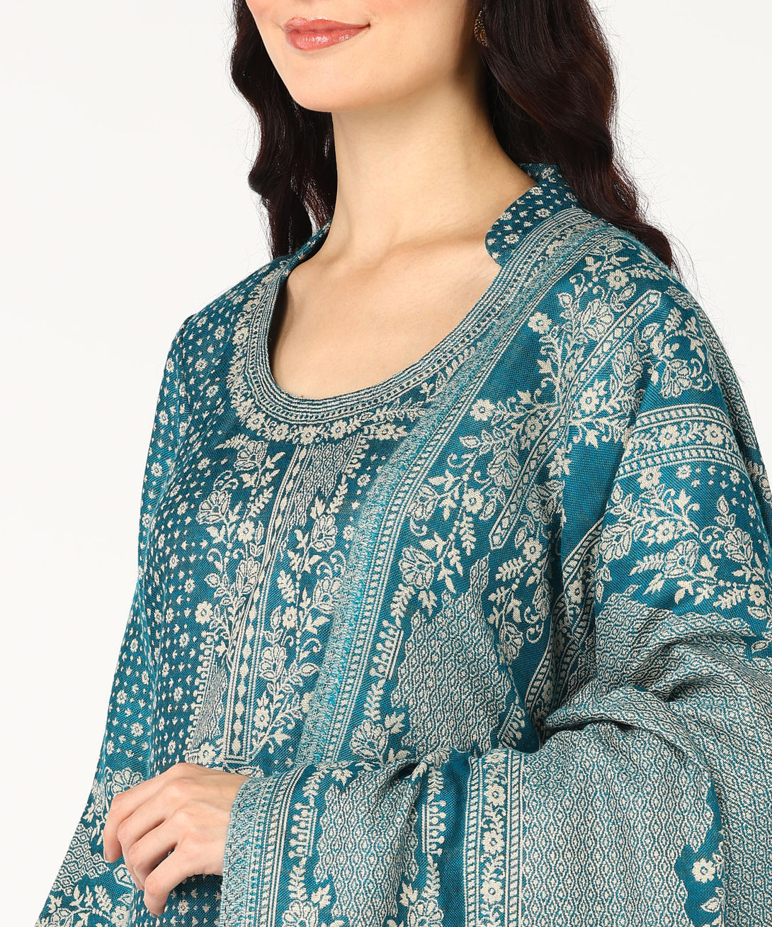 Enjoy a sophisticated look with the tranquil Sea Green Women's Cottswool Unstitched Kurta & Palazzo Suit Material from Jayri. This outfit has a matching shawl and is adorned with a detailed Kani Jamawar design. Perfect for the colder months, it skillfully blends coziness and elegance to create a fashionable yet comfortable winter costume.