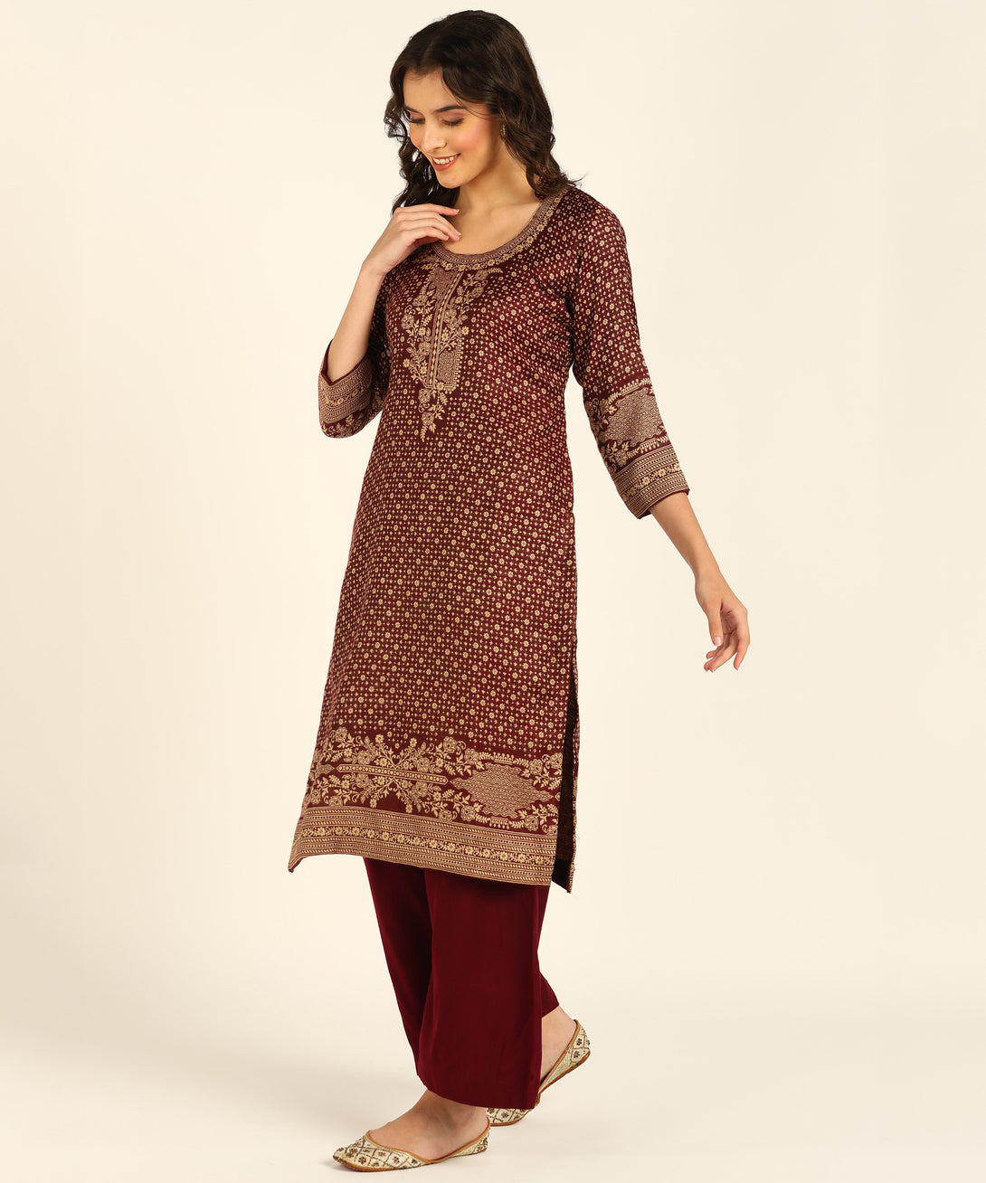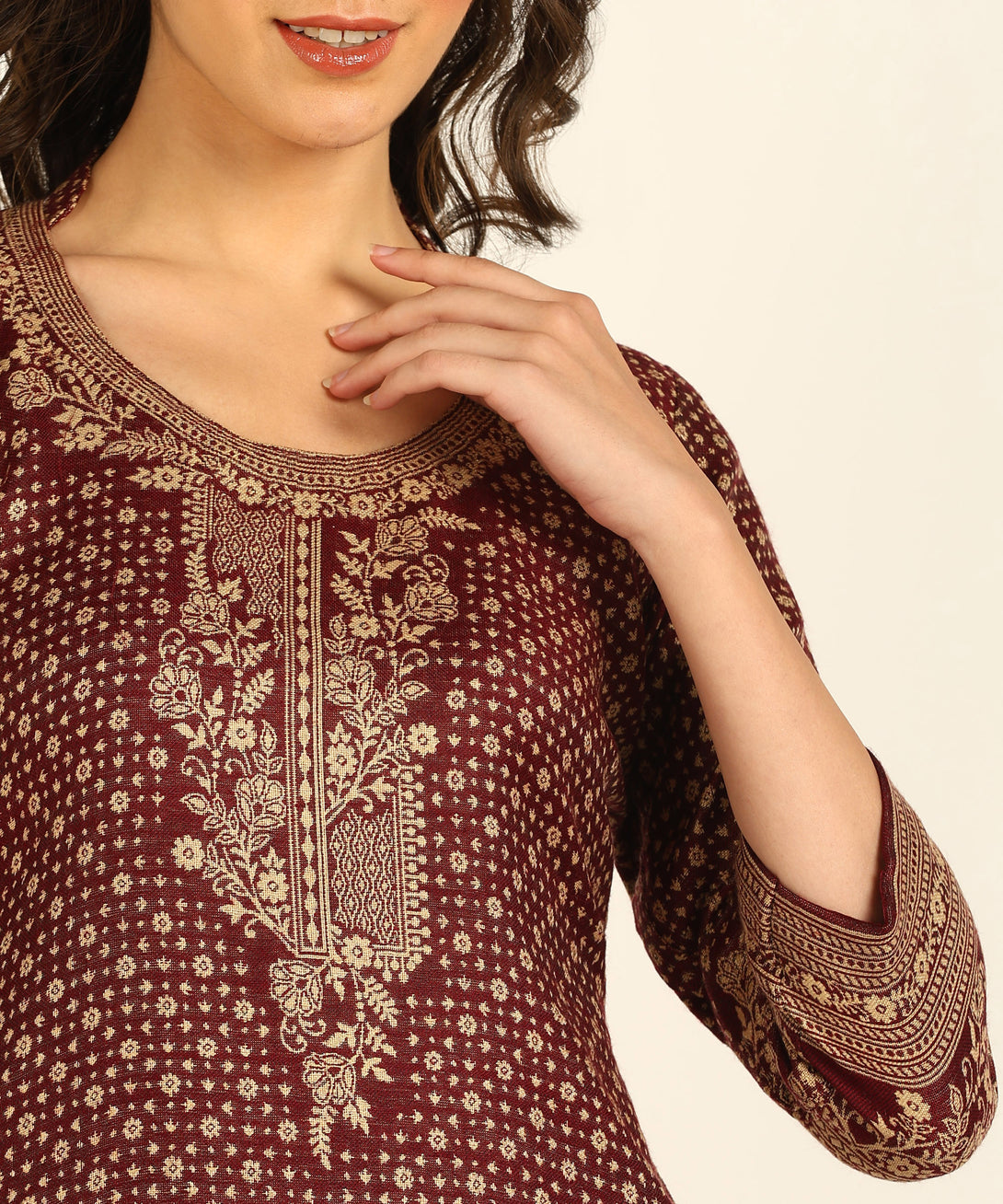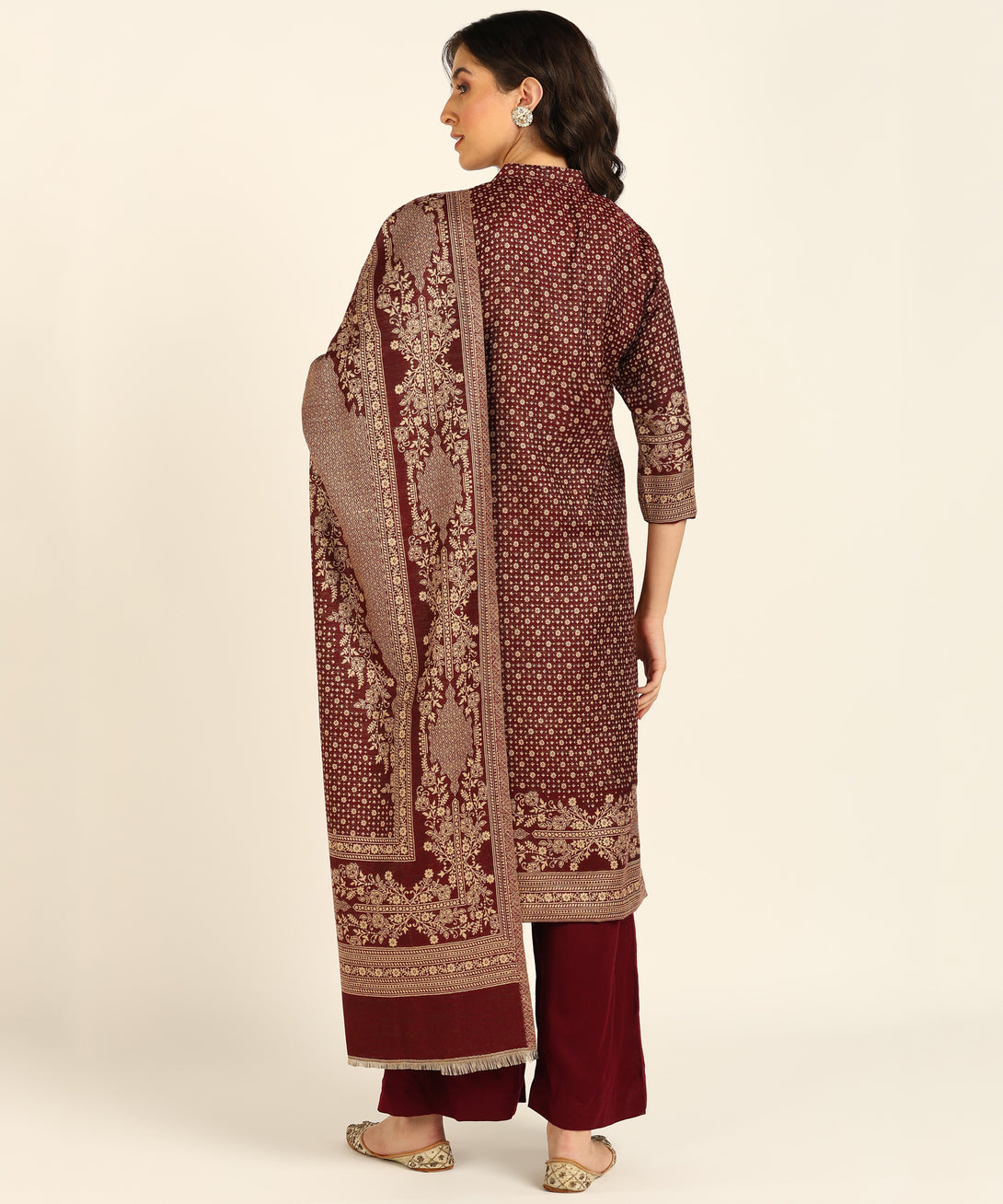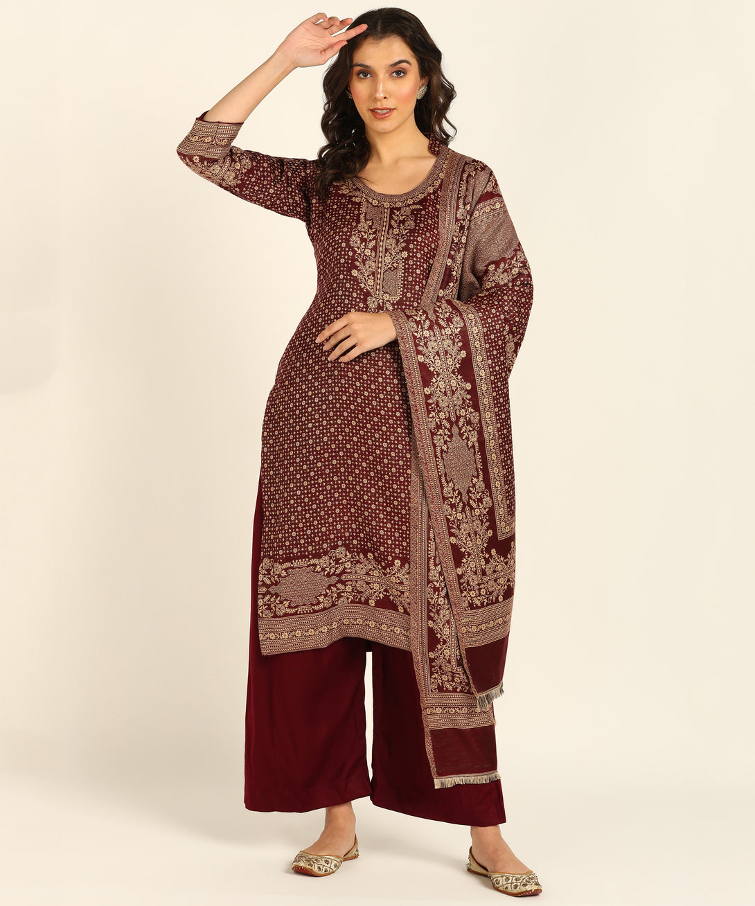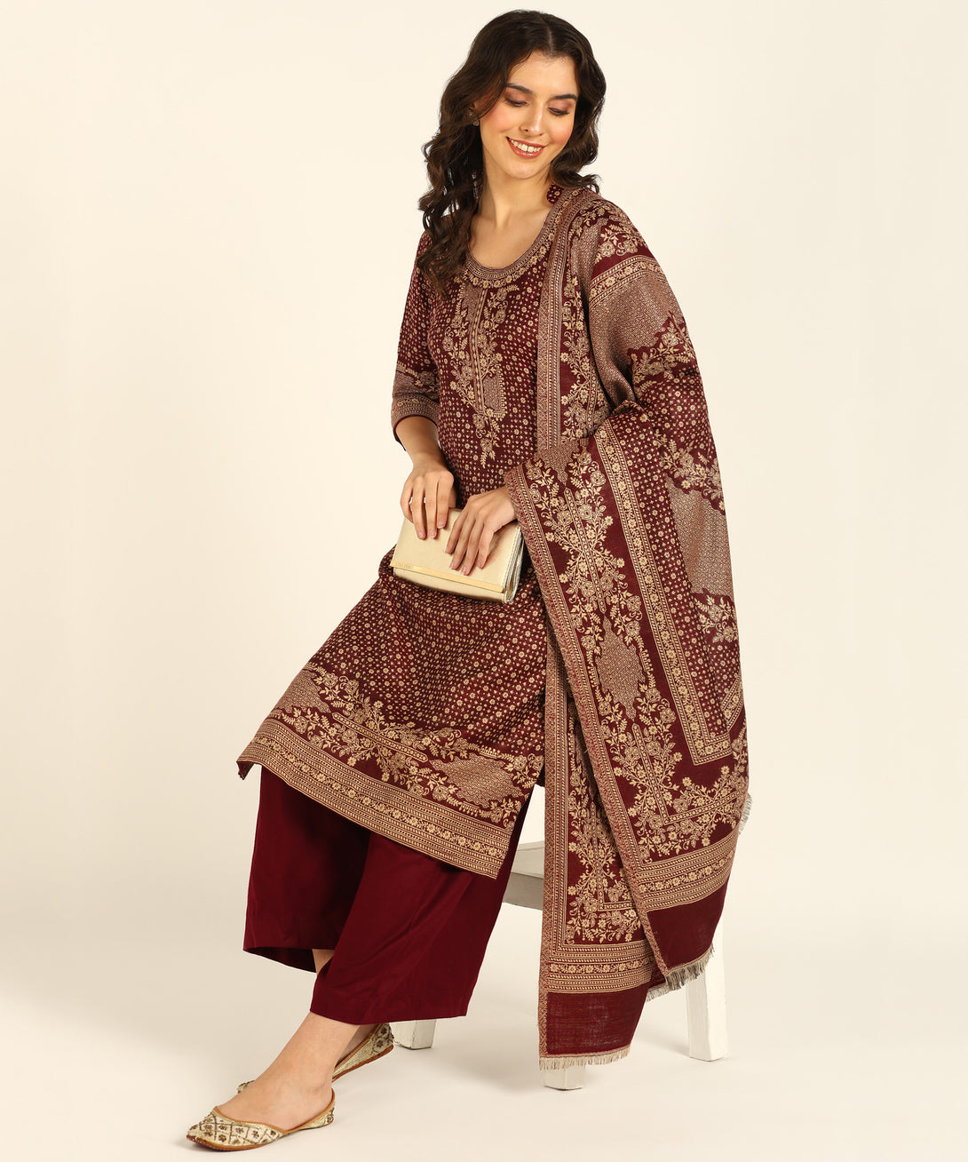 With Jayri's Women's Rich Wine Cottswool Unstitched Kurta & Palazzo Suit Material, introduce elegance. This outfit has a matching shawl and an amazing Kani Jamawar...