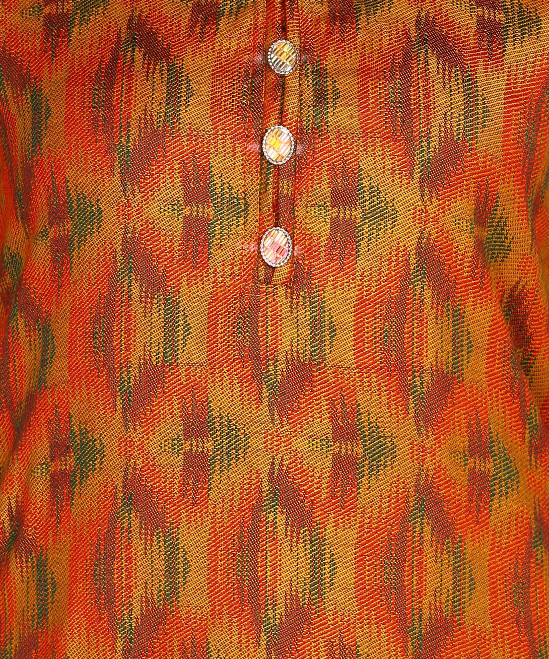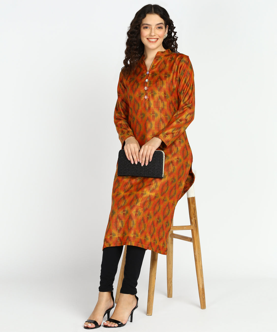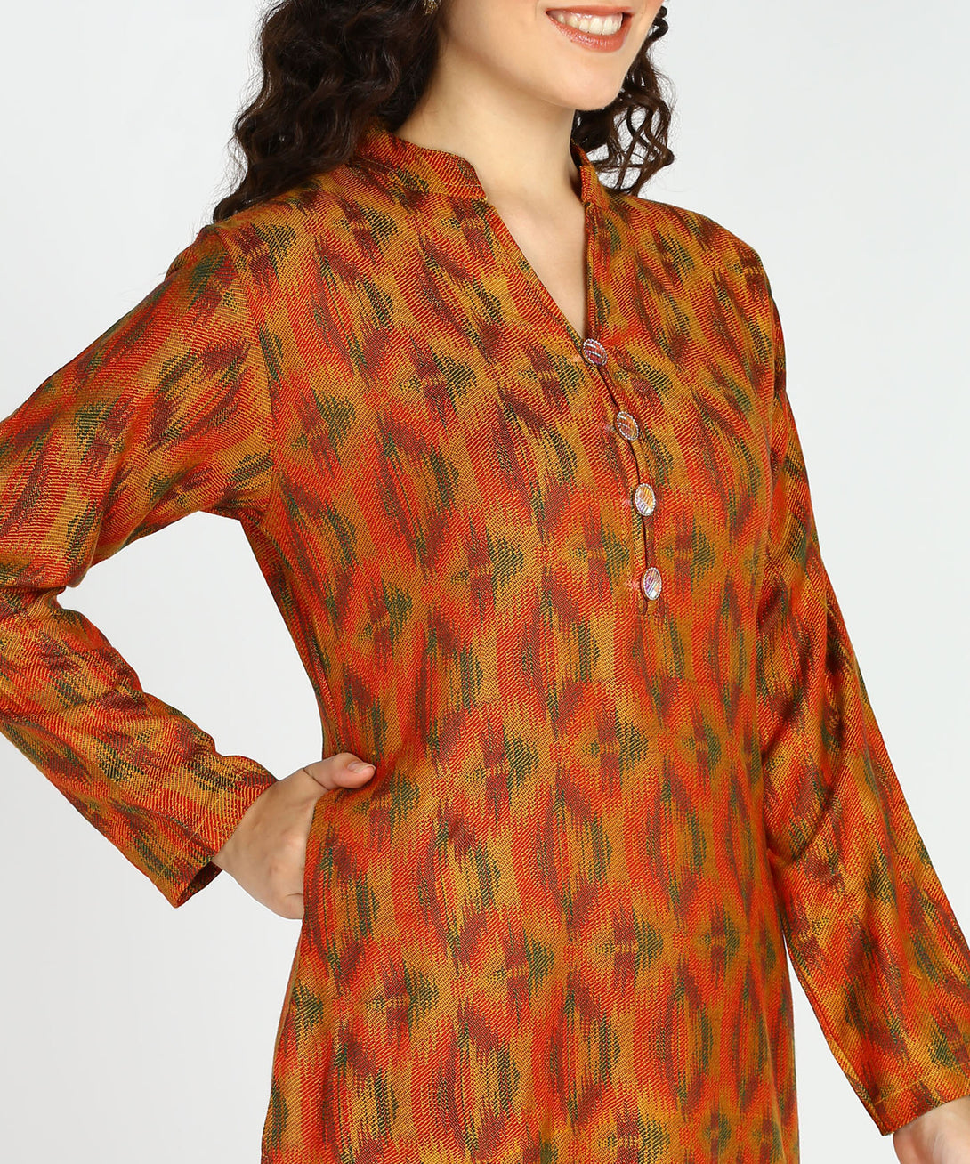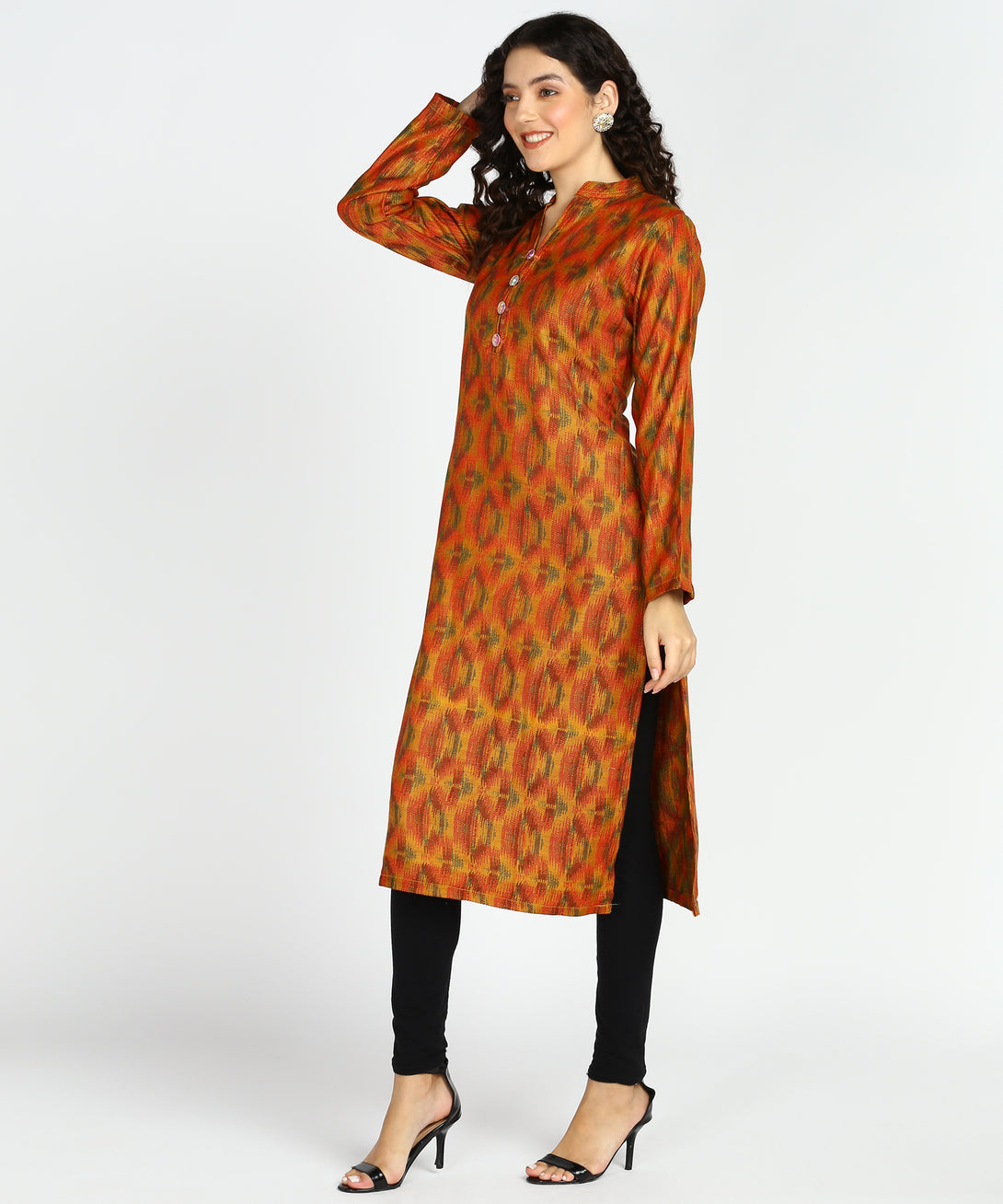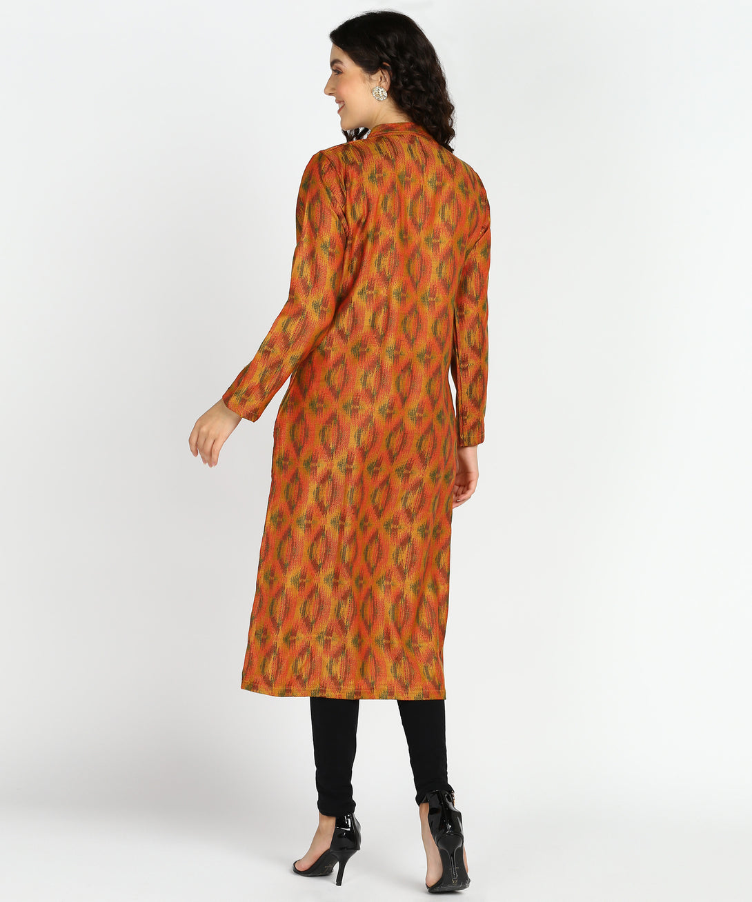 Jayri Women's Pure Woolen Long Kurti with Pockets for Winters (Orange & Red Pattern)