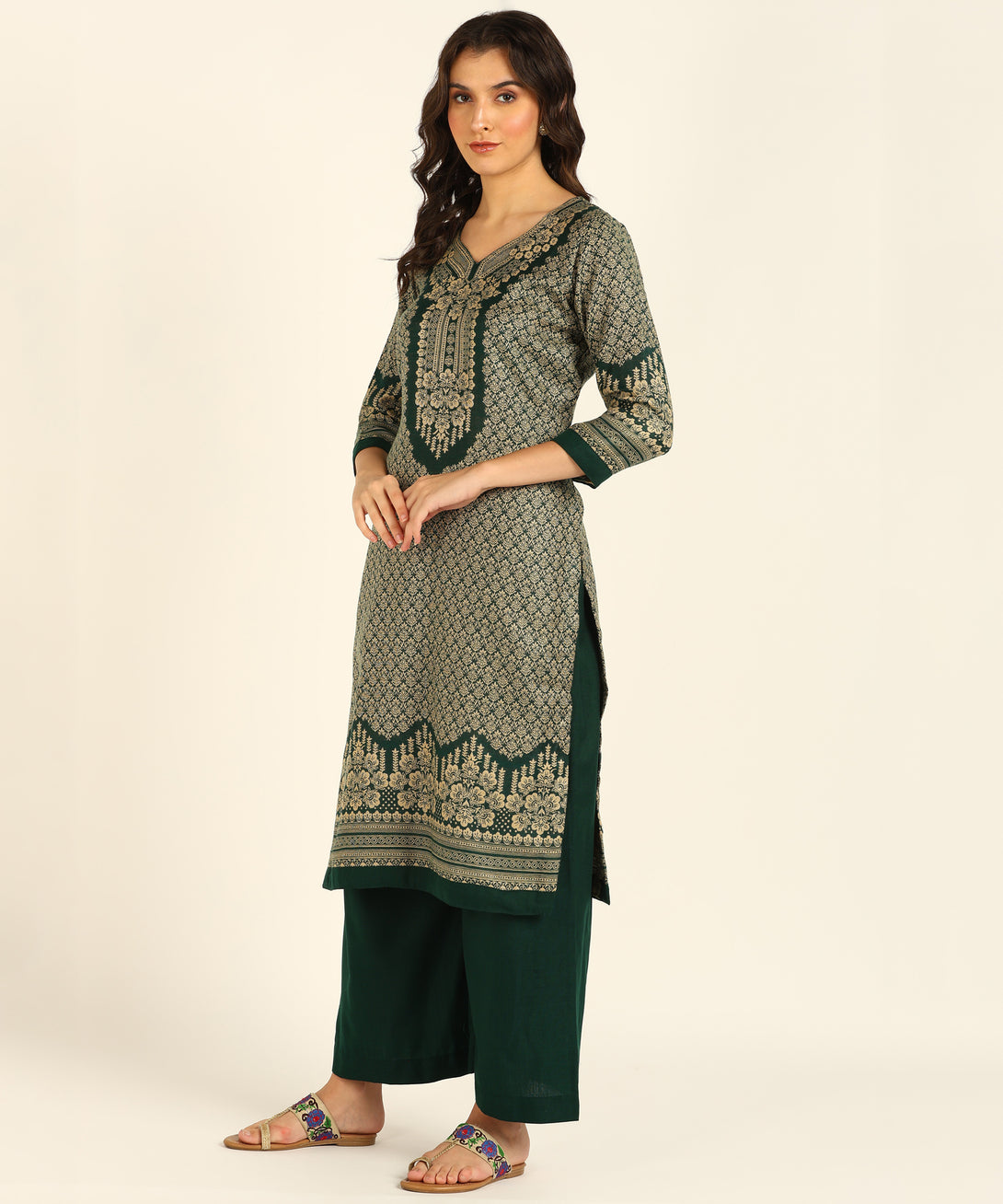 With Jayri's Women's Woolen Unstitched Kurta & Palazzo Kani Jamawar Design Suit Material in a sophisticated Dark Green color, warmth and sophistication are introduced. This...