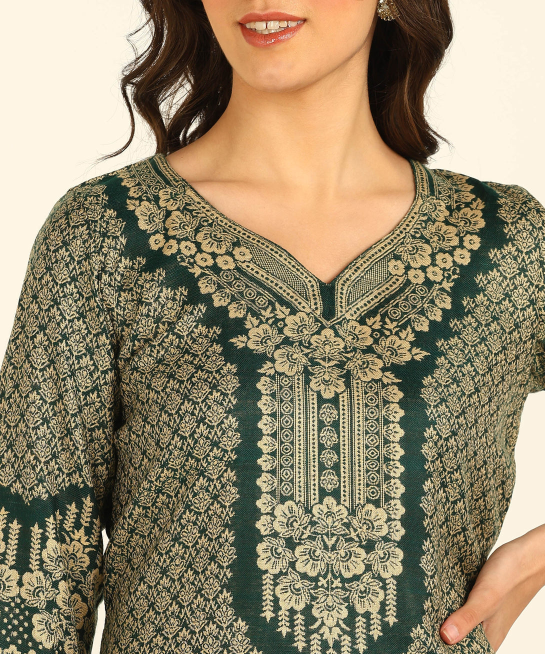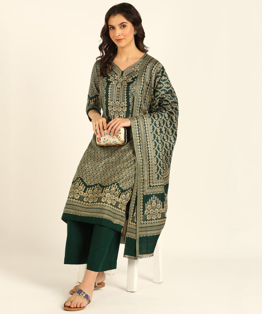 With Jayri's Women's Woolen Unstitched Kurta & Palazzo Kani Jamawar Design Suit Material in a sophisticated Dark Green color, warmth and sophistication are introduced. This whole look, with the matching scarf, is very charming for winter. It is seasonally appropriate, combining comfort and style to create a stylish yet warm winter costume.
