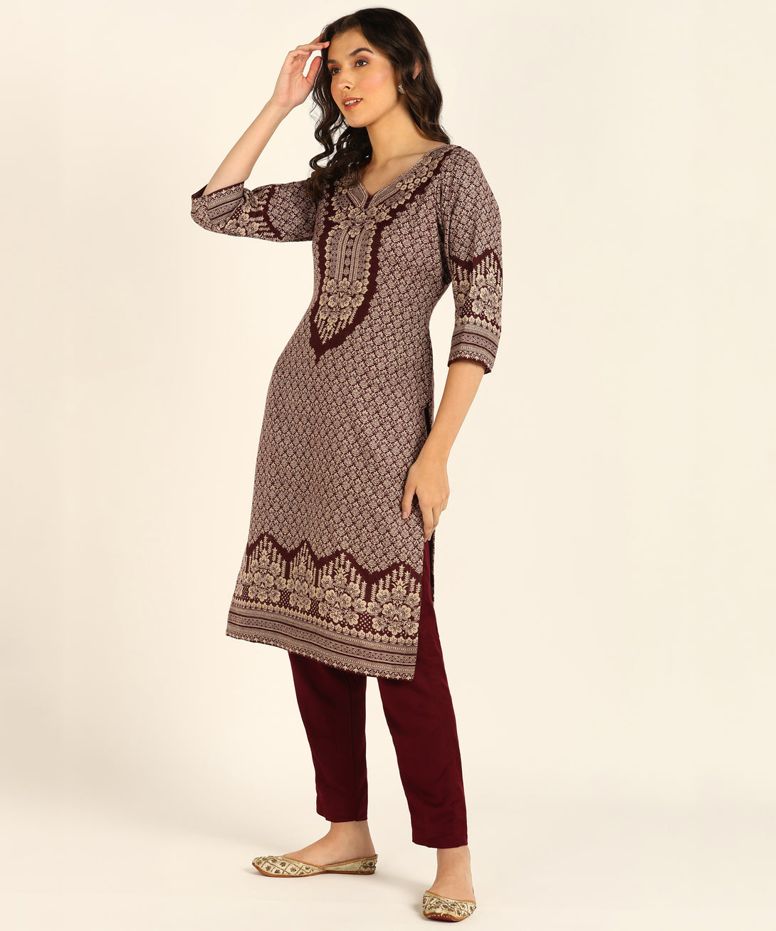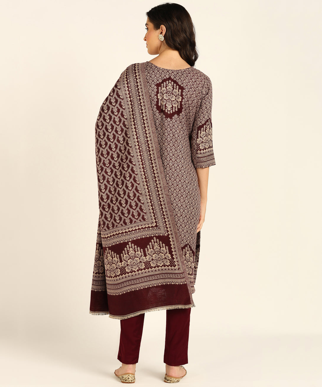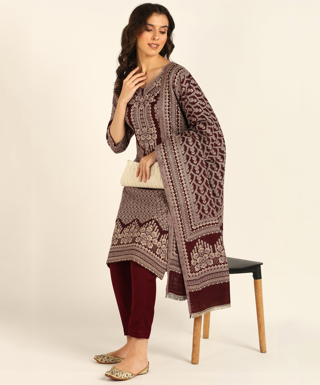 Introducing refinement in a gorgeous wine shade with Jayri's Women's Woolen Unstitched Kurta & Palazzo Kani Jamawar Design Suit Material. This cozy and elegant winter set comes with a matching shawl. It is seasonally appropriate, combining comfort and style to create a stylish yet warm winter costume.
