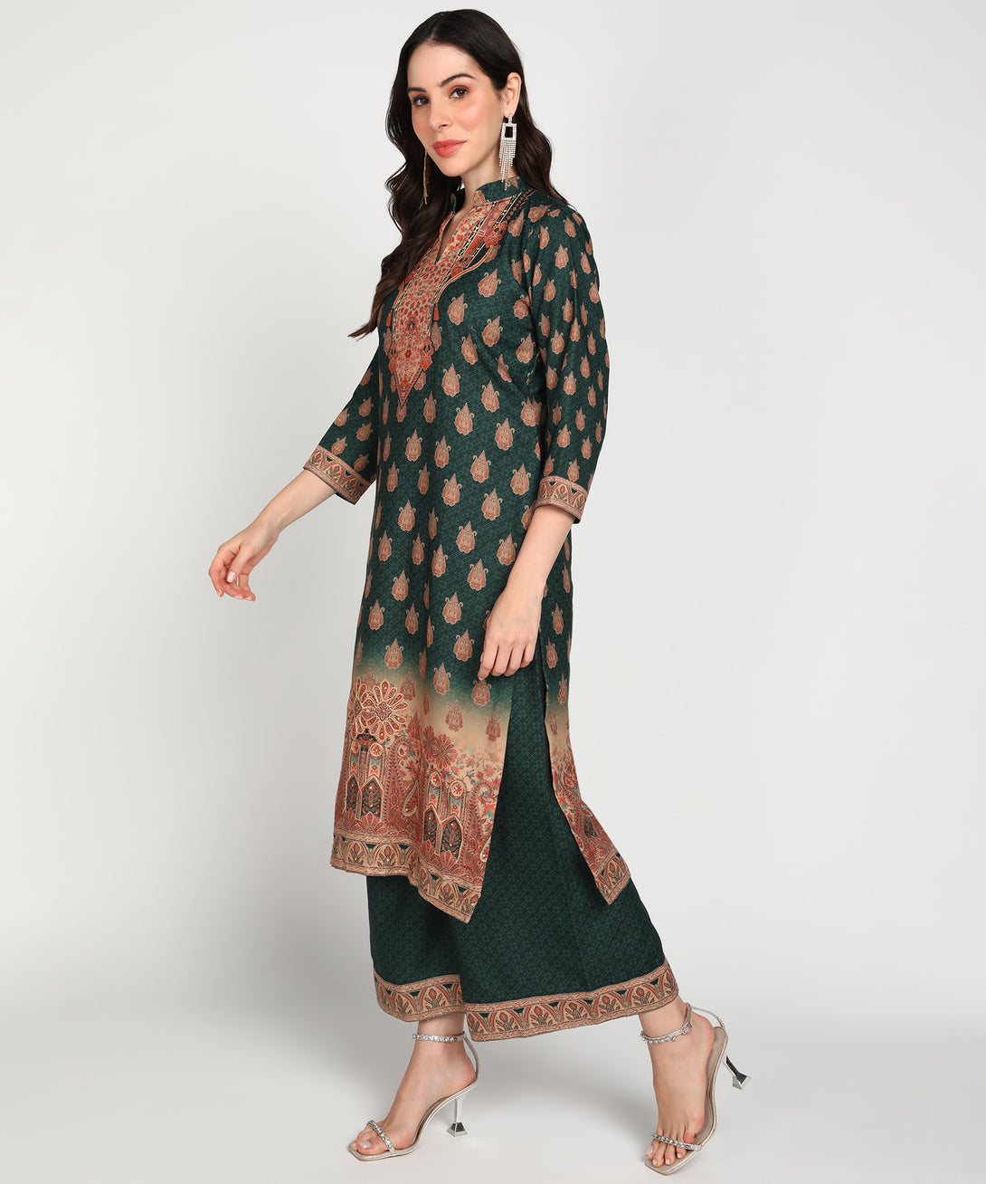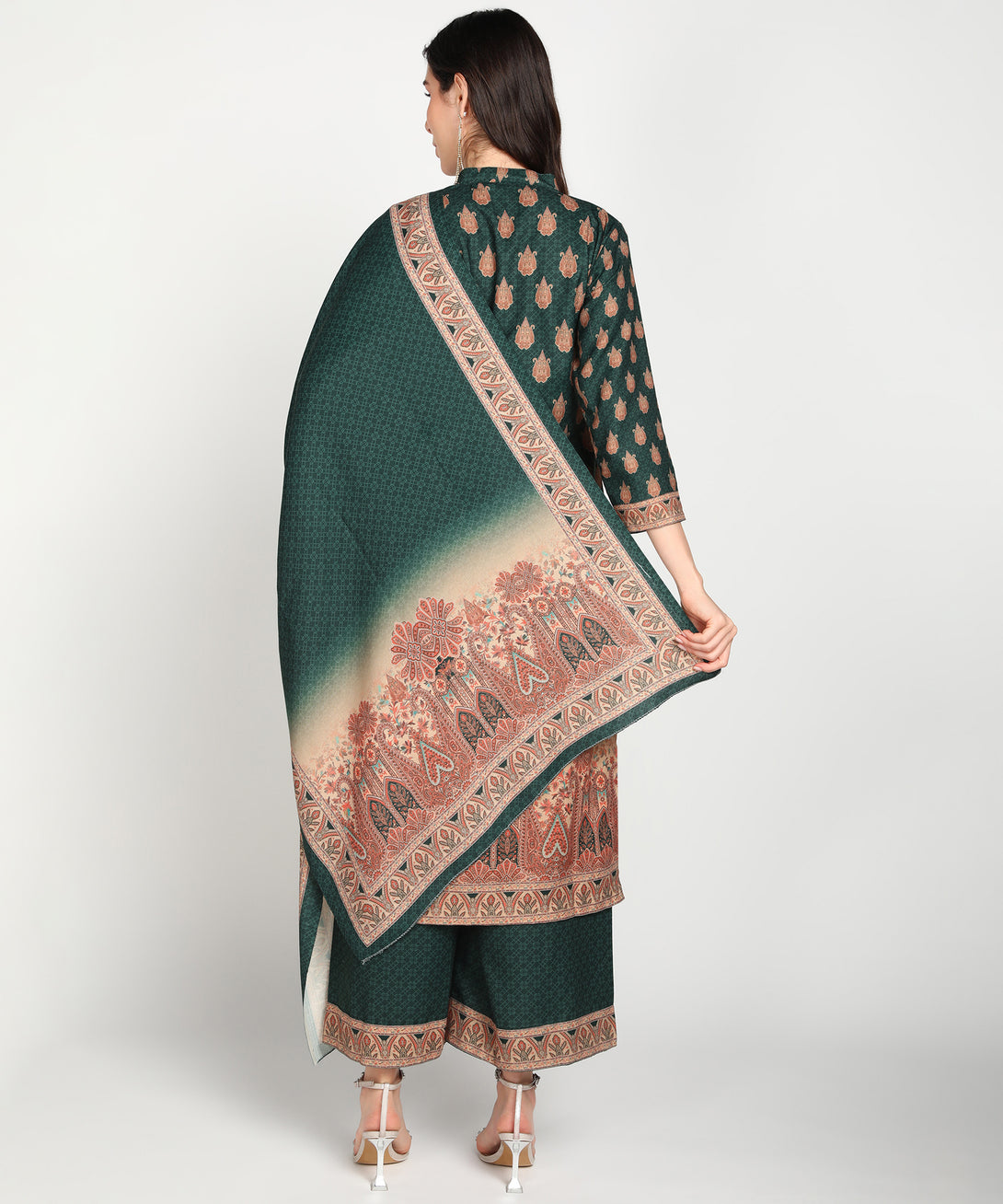 * Pattern Style: Printed Suit/Self Design/Jamawar suits/Printed suits; with EMBROIDERY and SWAROVSKI work and Included Components: Unstitched Kurti and Palazzo suit material for winter; Top- 2.5 meters, Bottom-2.5m, Stole- 2m