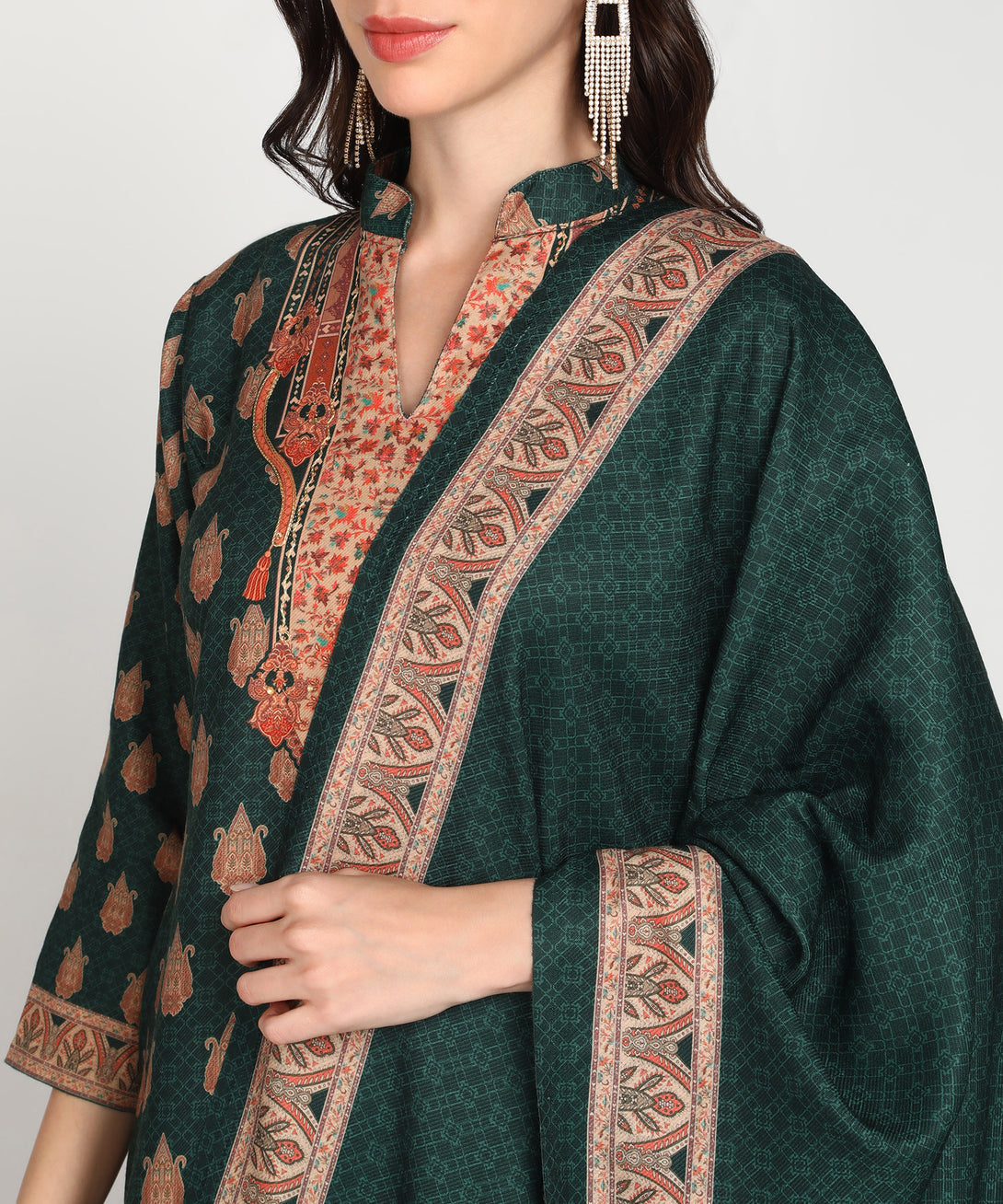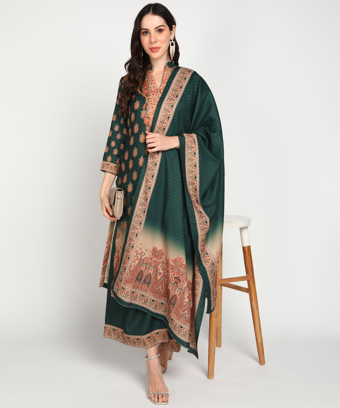 * Fabric: Acrylic Wool - This unique blend of Wool will keep you warm and comfortable. It makes an ideal winter suit for women along with making it stylish and long lasting. It also comes with a shawl/stole for a complete elegant ethnic look