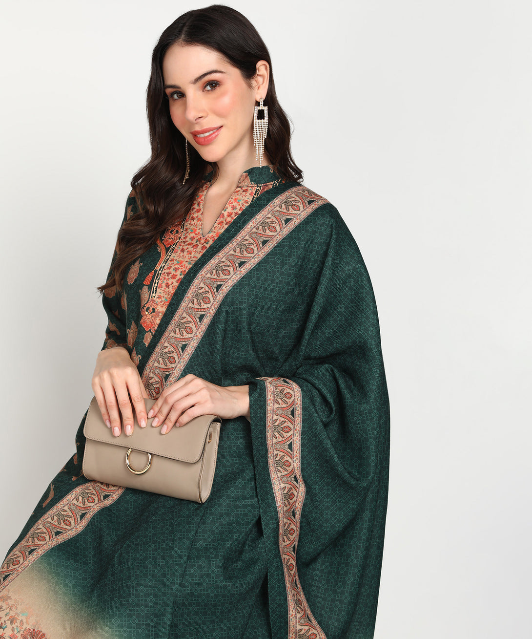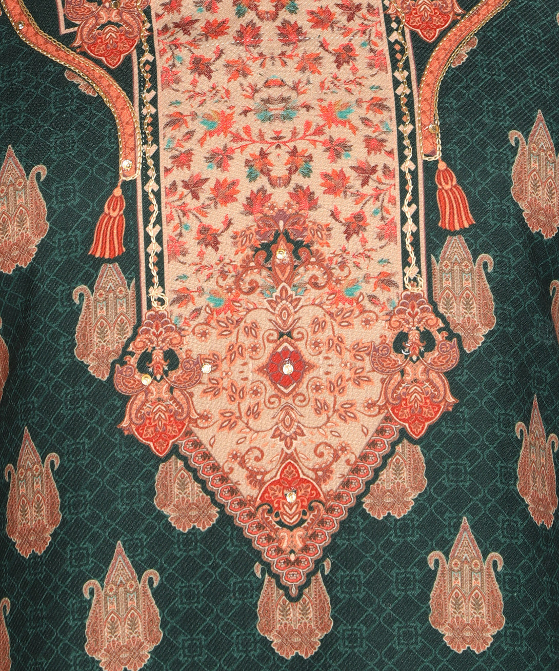 With its opulent Dark Green tint, Jayri's Women's Woolen Unstitched Printed Suit Material introduces warmth and grandeur. Complete with matching stoles, these ensembles are adorned with exquisite stone work and embroidery. It is designed for the winter and combines comfort and style, making it ideal for a stylish yet homey winter ensemble.
