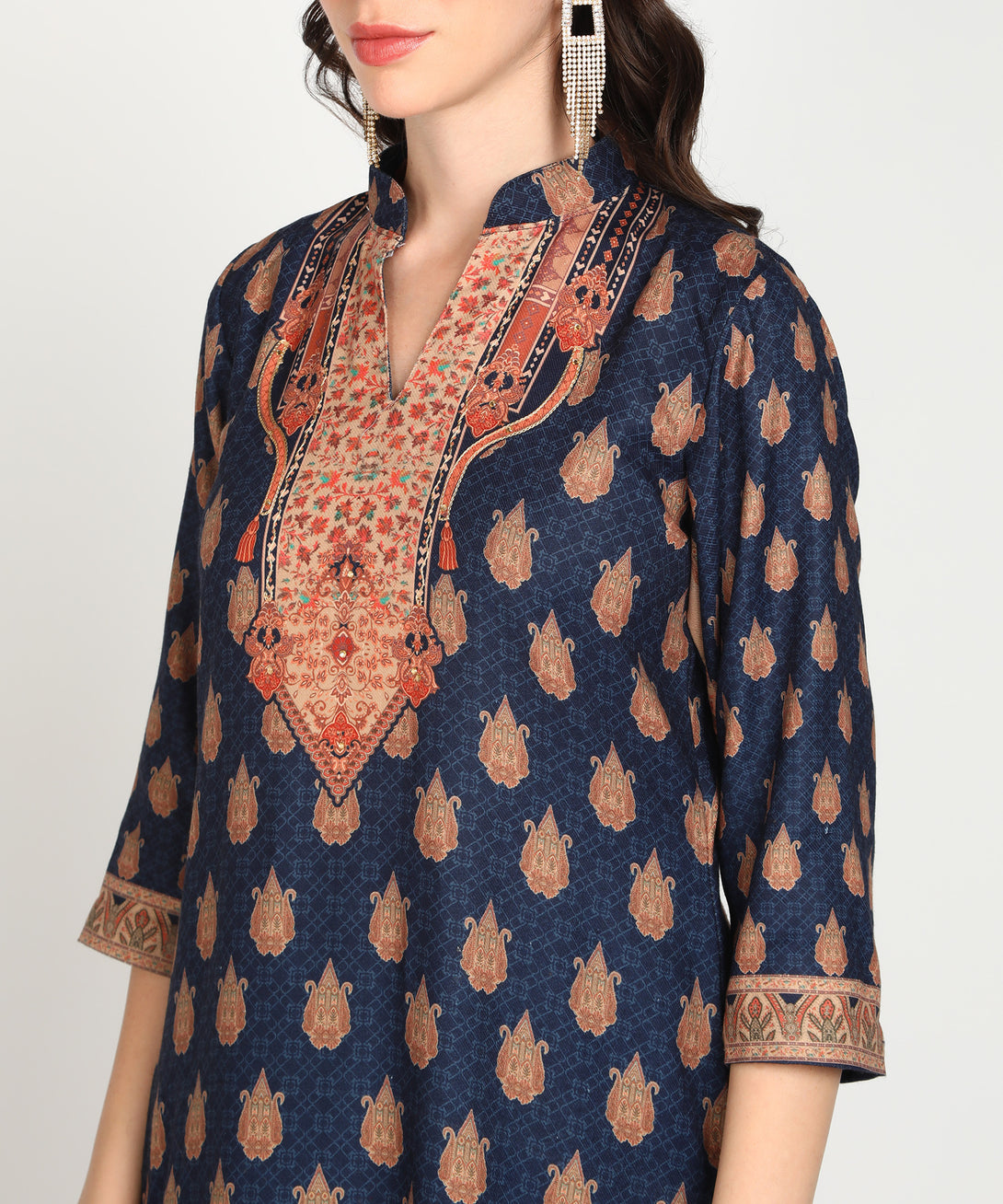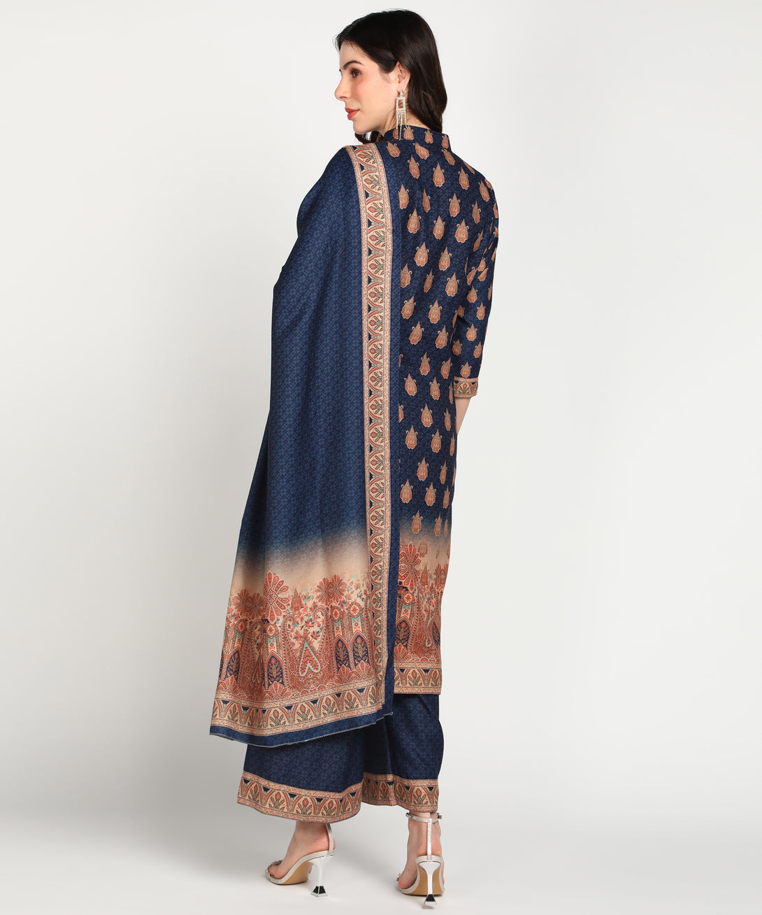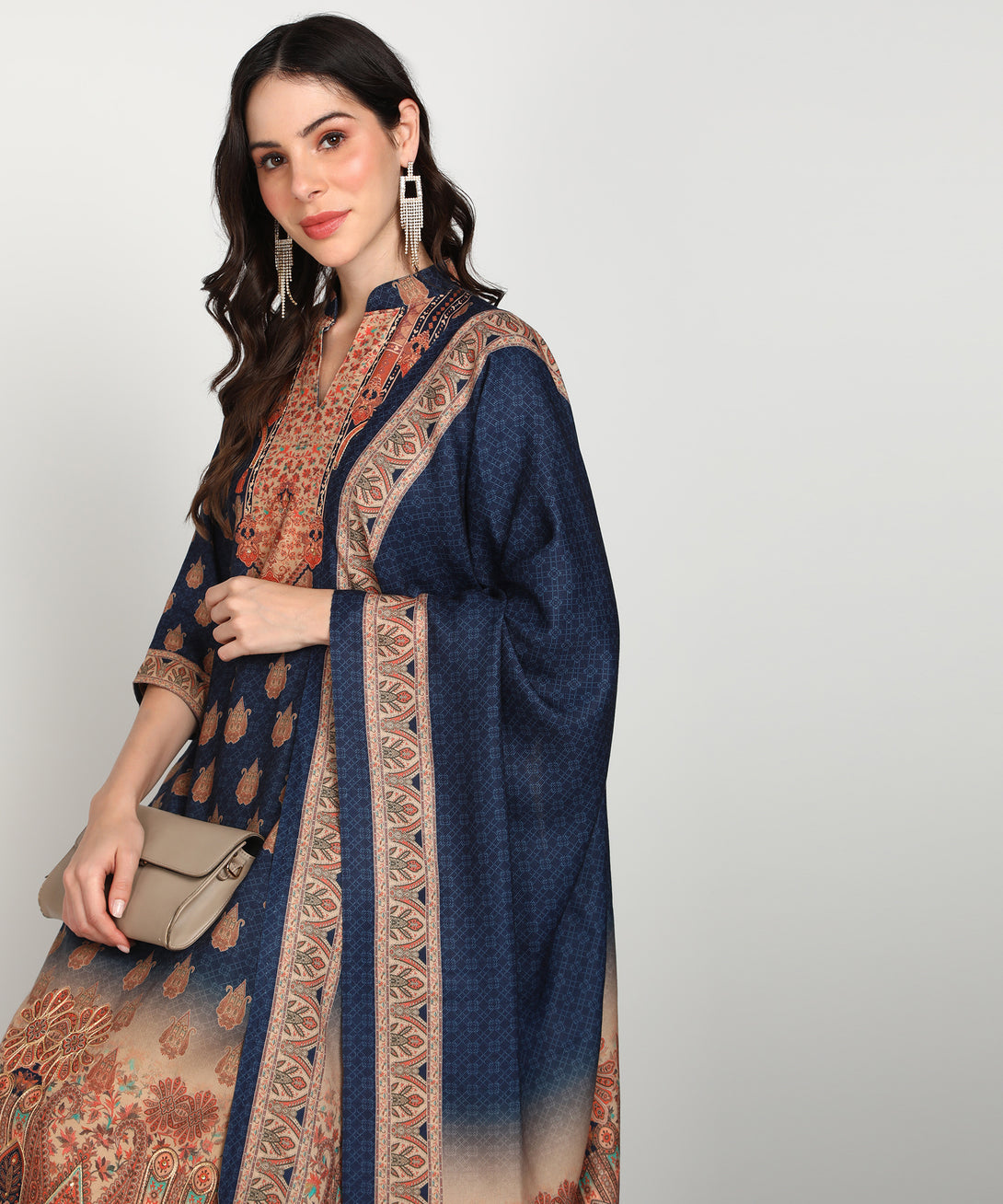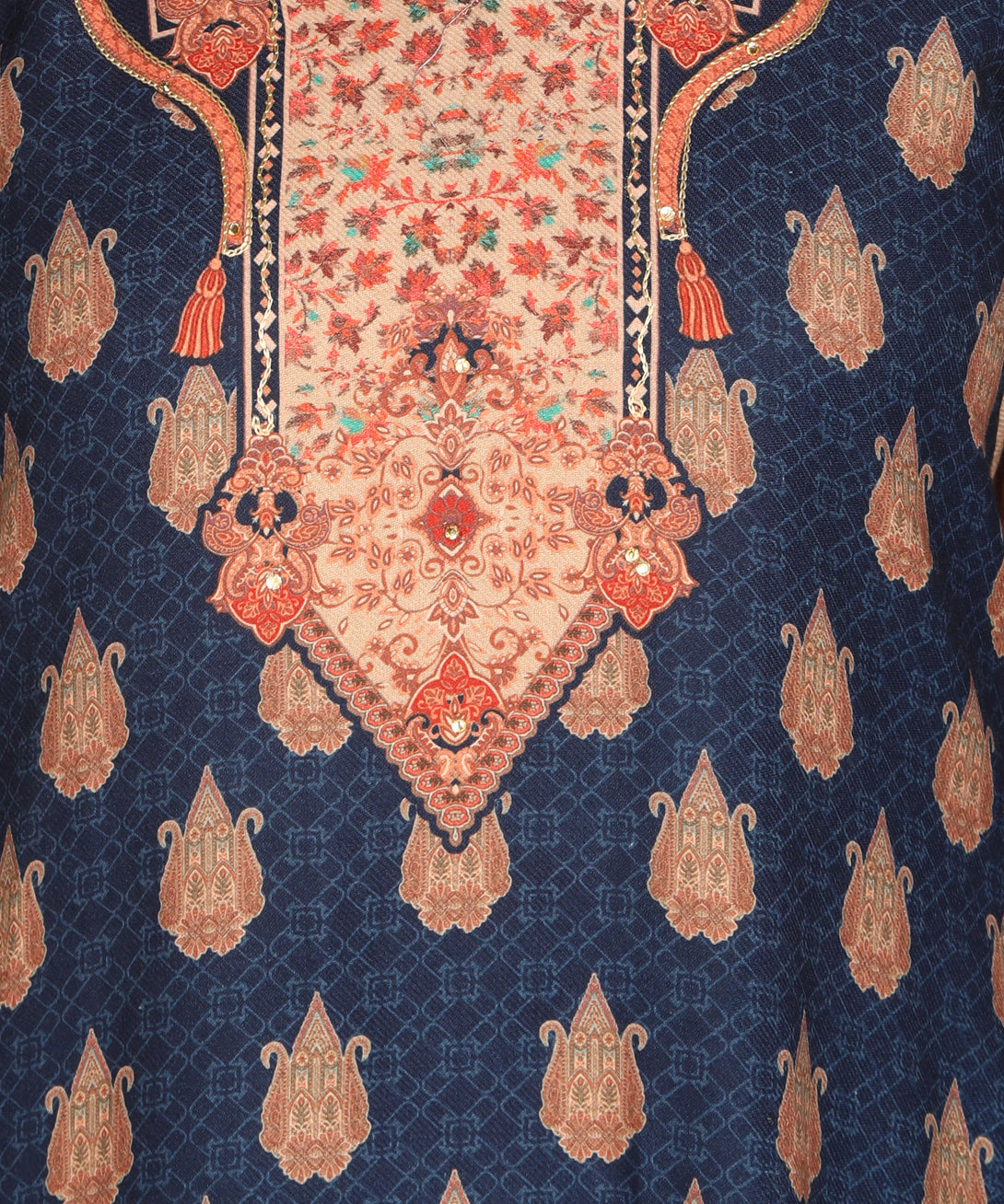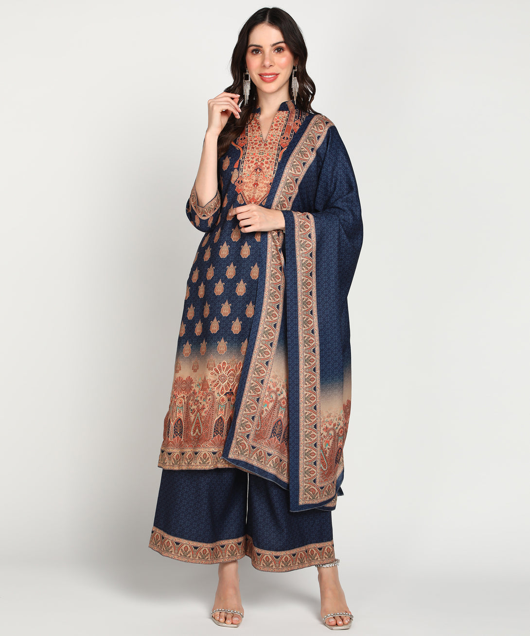 Enjoy a sophisticated look with the captivating Navy Blue Women's Woolen Unstitched Printed Suit Material from Jayri. Each costume is adorned with fine stone work and embroidery, and a matching stole completes the look. Its winter-ready design combines warmth and elegance, making it the ideal piece for a stylish yet comfortable combination.