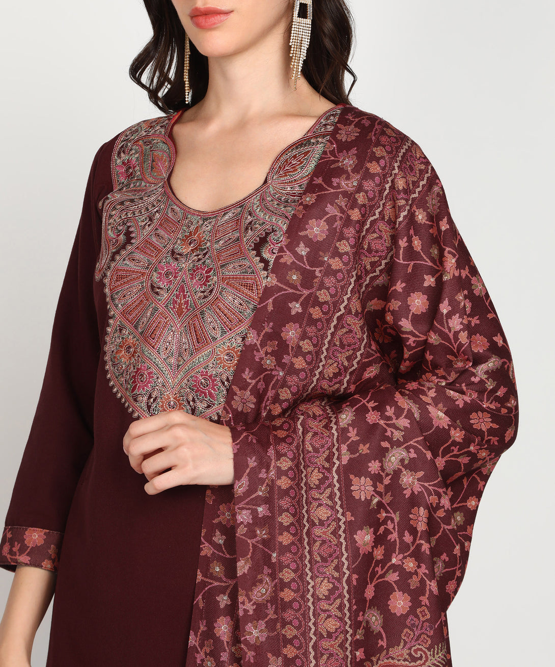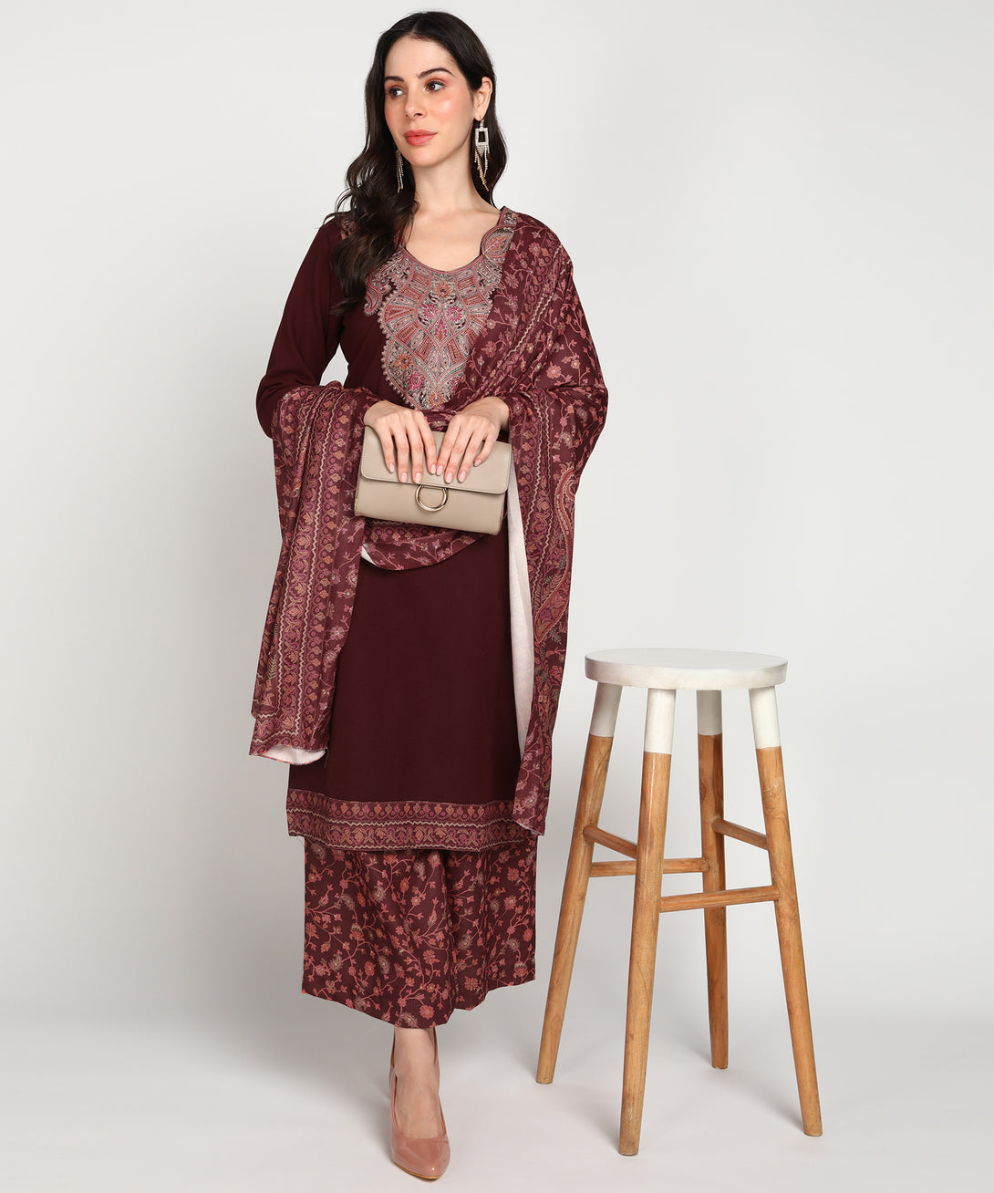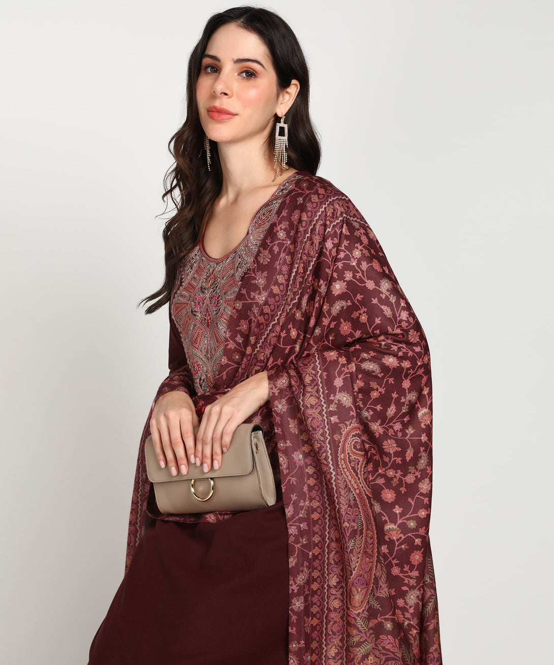 Presenting the regal Maroon color of Jayri's Women's Woolen Unstitched Printed Suit Material, which exudes warmth and luxury. Each outfit is accessorized with a matching stole and is decorated with detailed embroidery. Its winter-appropriate design balances comfort and elegance, making it ideal for a stylish yet comfortable winter suit that radiates grace and style.