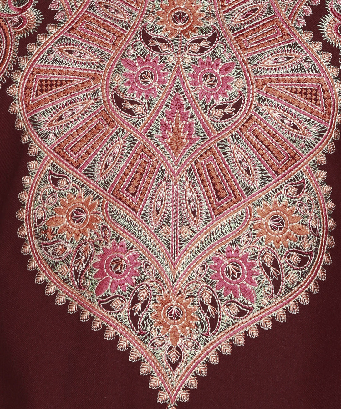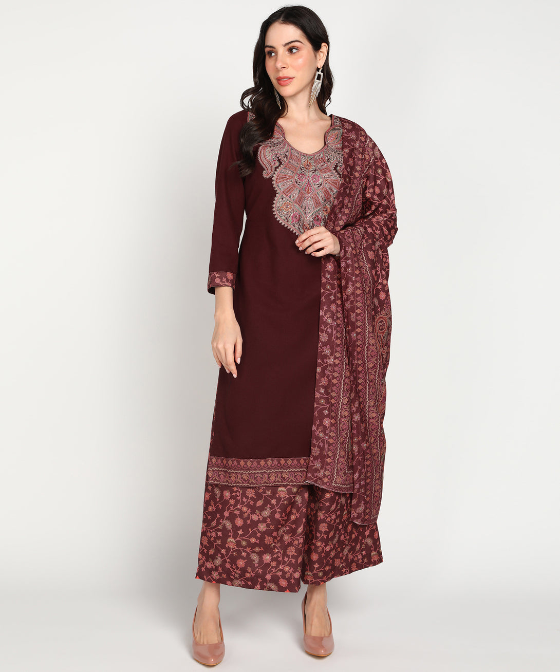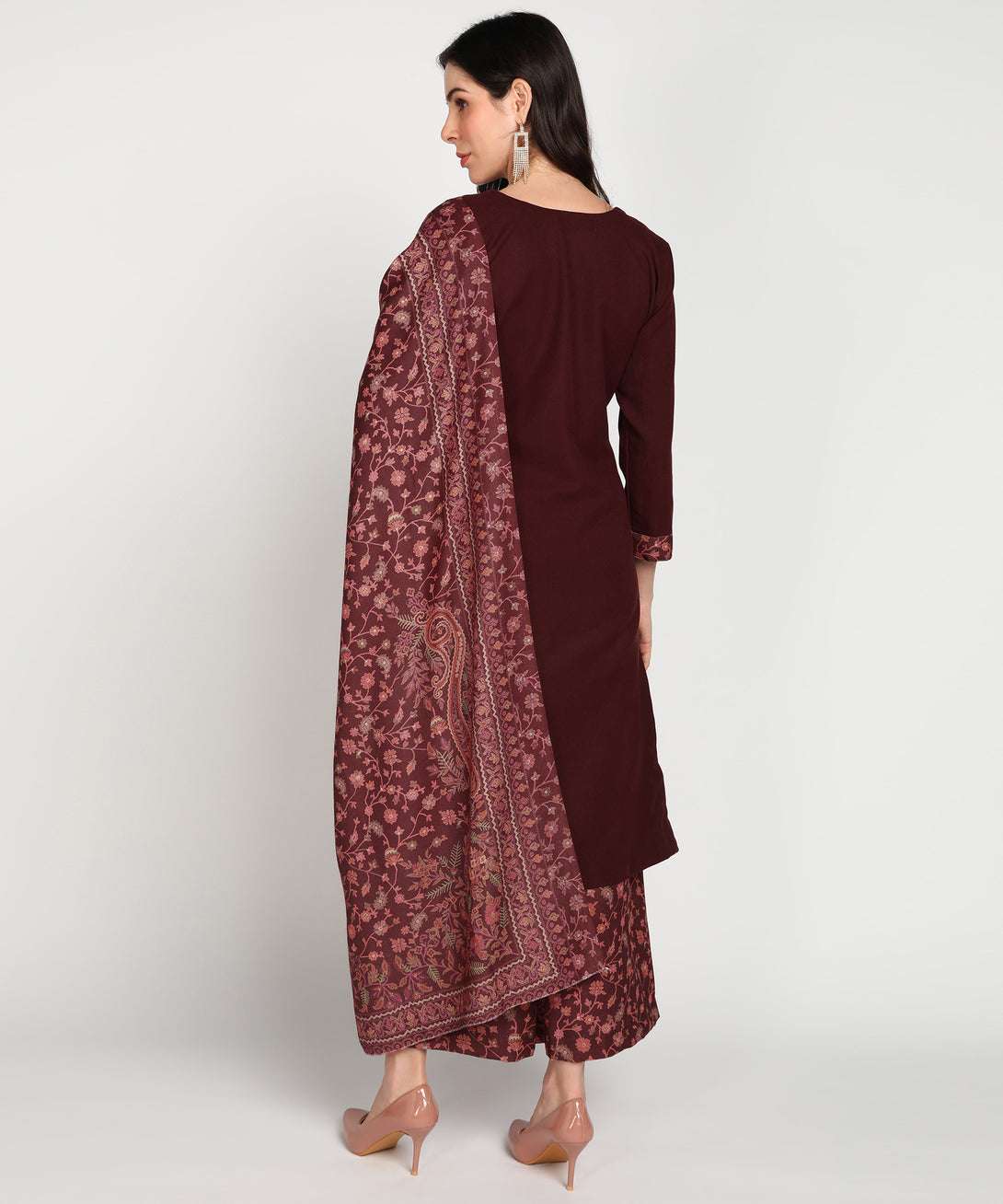 Presenting the regal Maroon color of Jayri's Women's Woolen Unstitched Printed Suit Material, which exudes warmth and luxury. Each outfit is accessorized with a matching stole and is decorated with detailed embroidery. Its winter-appropriate design balances comfort and elegance, making it ideal for a stylish yet comfortable winter suit that radiates grace and style.