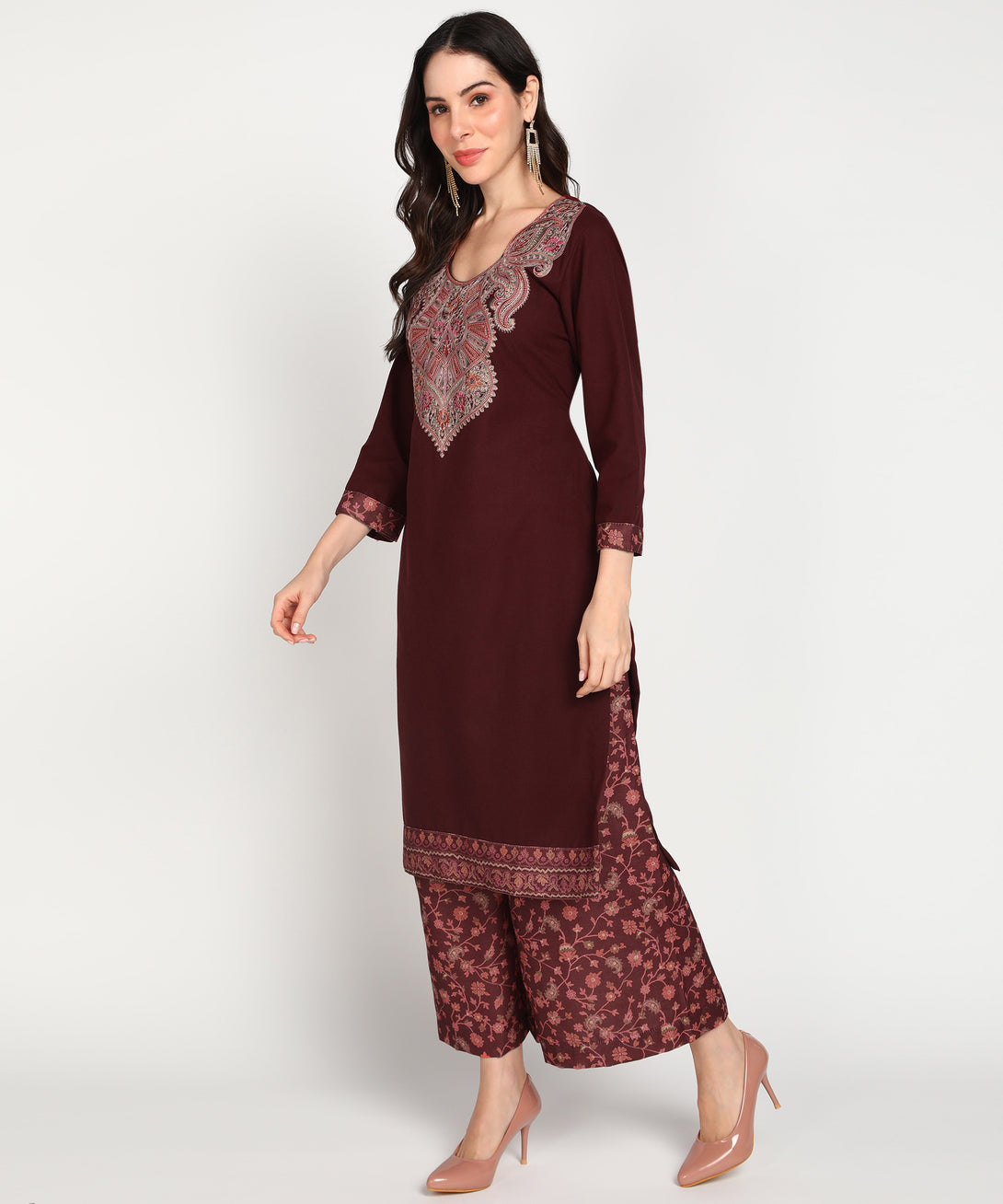 * Fabric: Acrylic Cottswool - This unique blend of Wool will keep you warm and comfortable. It makes an ideal winter suit for women along with making it stylish and long lasting. It also comes with a shawl/stole for a complete elegant ethnic look