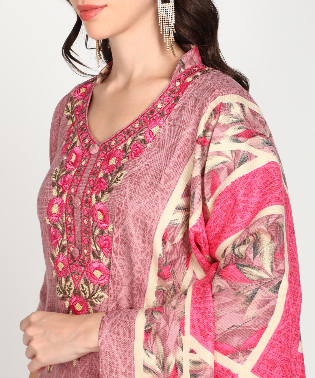 Jayri Women's Woolen Unstitched Printed Suit Material with Embroidery With Stole for Winter (Pink)